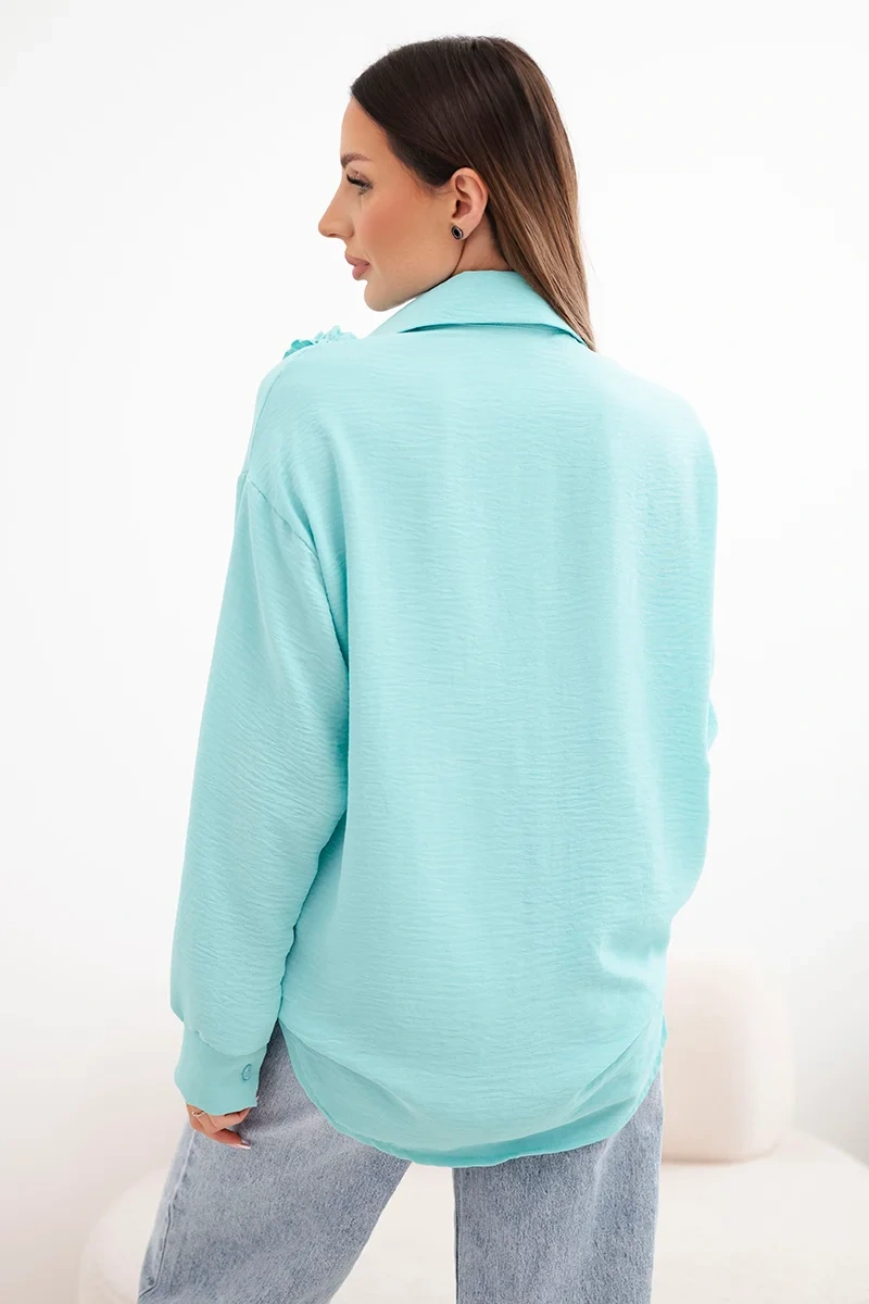 Koszula damska wiskozowa z długim rękawem i falbanami miętowa Elegancka koszula damska o luźnym, swobodnym fasonie to doskonała propozycja dla kobiet ceniących modny wygląd i wygodę. Model zapinany na guziki z klasycznym kołnierzykiem świetnie sprawdzi się zarówno w stylizacjach codziennych, jak i bardziej eleganckich. Asymetryczny krój z wydłużonym tyłem nadaje całości nowoczesnego charakteru i pięknie układa się na sylwetce.