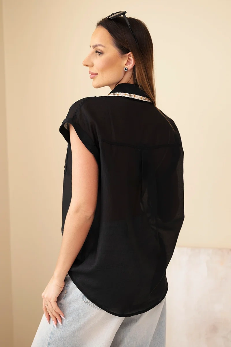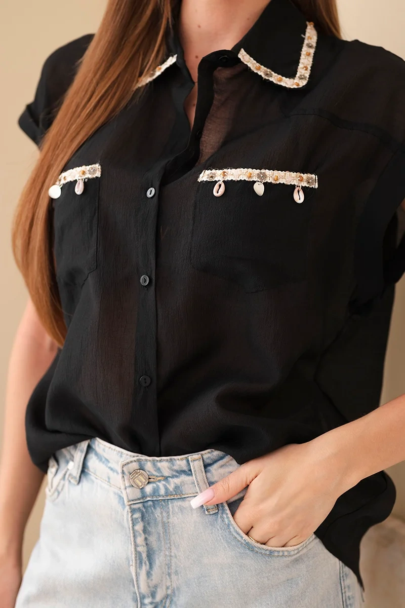 Koszula damska z tencelu z ozdobnym kołnierzykiem i kieszeniami czarna