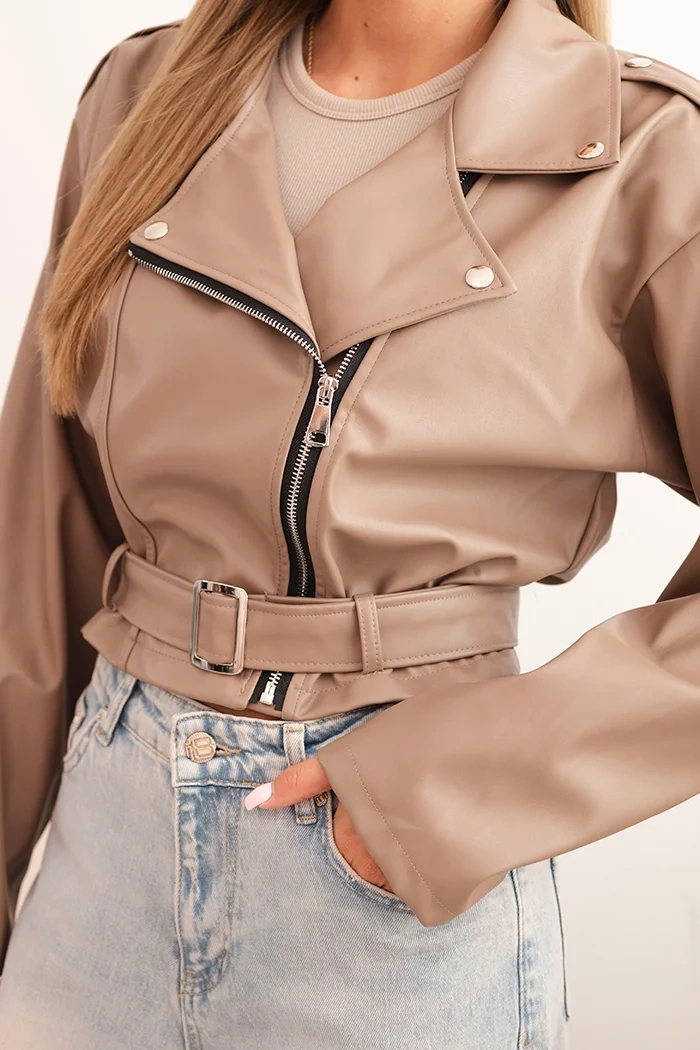 Kurtka damska krótka z eko skóry z paskiem i kołnierzem fango Nowoczesna kurtka damska o krótkim fasonie to propozycja dla kobiet ceniących miejski styl i wygodę. Model wykonany z gładkiego, lekko sztywnego materiału, świetnie się układa i przyciąga uwagę minimalistycznym designem. Kurtka posiada efektowny kołnierz, ozdobne napy, zapięcie na zamek oraz pasek w talii, który pozwala na lekkie dopasowanie do sylwetki.