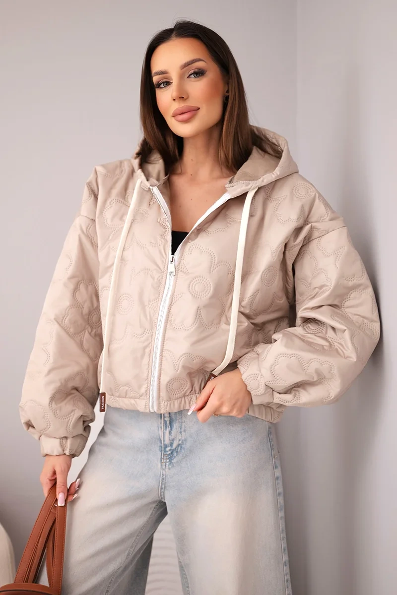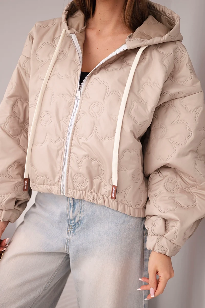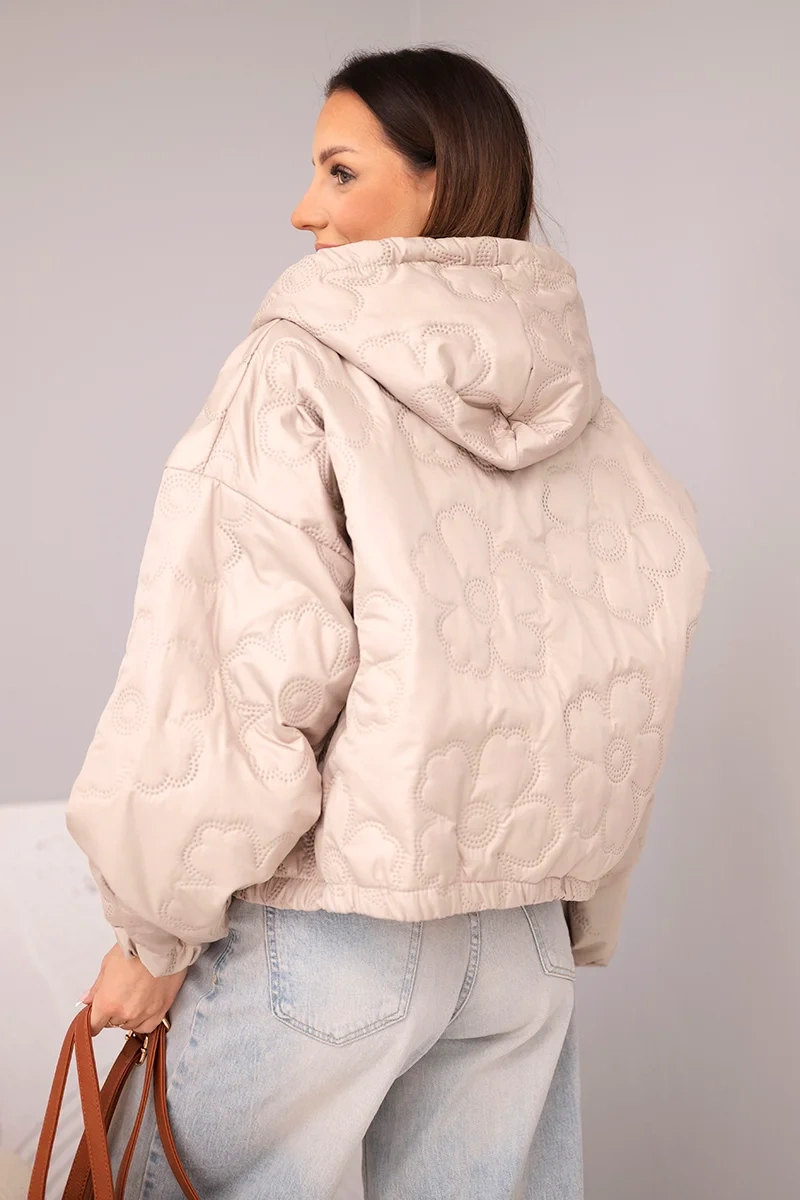 Kurtka damska pikowana z kapturem i ozdobnym tłoczeniem kwiatowym ciemno beżowa Stylowa kurtka damska pikowana to doskonała propozycja dla kobiet, które cenią modny wygląd i wygodę na co dzień. Model wyróżnia się efektownym tłoczeniem w kwiatowy wzór, które nadaje całości wyjątkowego charakteru i sprawia, że kurtka prezentuje się niezwykle kobieco. Krótszy fason świetnie podkreśla sylwetkę i doskonale komponuje się zarówno ze spodniami z wysokim stanem, jak i dopasowaną spódnicą.