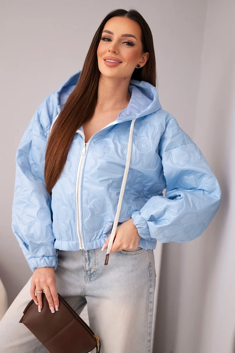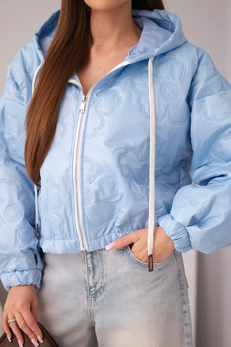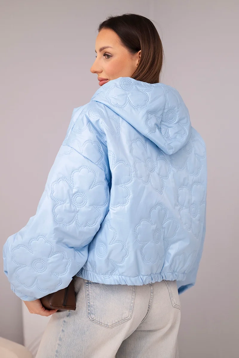 Kurtka damska pikowana z kapturem i ozdobnym tłoczeniem kwiatowym niebieska Stylowa kurtka damska pikowana to doskonała propozycja dla kobiet, które cenią modny wygląd i wygodę na co dzień. Model wyróżnia się efektownym tłoczeniem w kwiatowy wzór, które nadaje całości wyjątkowego charakteru i sprawia, że kurtka prezentuje się niezwykle kobieco. Krótszy fason świetnie podkreśla sylwetkę i doskonale komponuje się zarówno ze spodniami z wysokim stanem, jak i dopasowaną spódnicą.