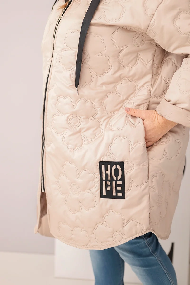 Kurtka damska Plus Size pikowana z kapturem i napisem HOPE ciemno beżowa Ta kurtka damska Plus Size pikowana z poliestru to idealny model na sezon przejściowy. Lekko oversize’owy krój zapewnia wygodę i swobodę ruchów, a ciekawy wzór pikowania nadaje jej nowoczesnego stylu. Model posiada praktyczny kaptur z szerokimi sznurkami, wygodny zamek na całej długości oraz ozdobną naszywkę HOPE nadającą całości modnego charakteru. Kurtka świetnie sprawdzi się na co dzień – do jeansów, dresów czy casualowych stylizacji.