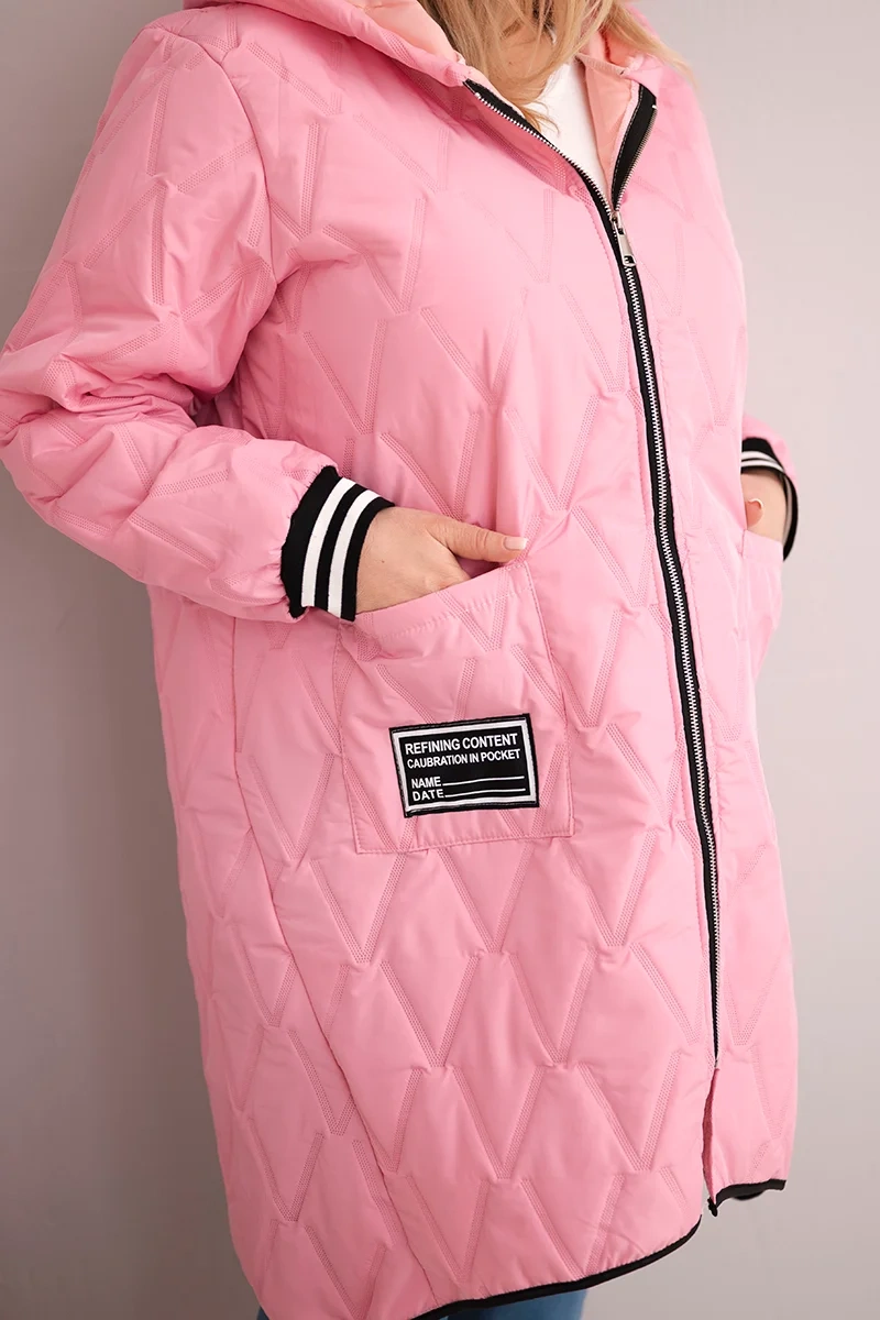 Kurtka damska Plus Size pikowana z kapturem i sportowymi mankietami jasno różowa Stylowa kurtka damska Plus Size pikowana to idealne połączenie wygody, ciepła i modnego wyglądu. Wykonana z lekkiego, a zarazem dobrze izolującego materiału, świetnie sprawdzi się w chłodniejsze dni. Posiada praktyczny kaptur, wygodne kieszenie oraz sportowe mankiety w kontrastowe paski, które dodają jej nowoczesnego charakteru.