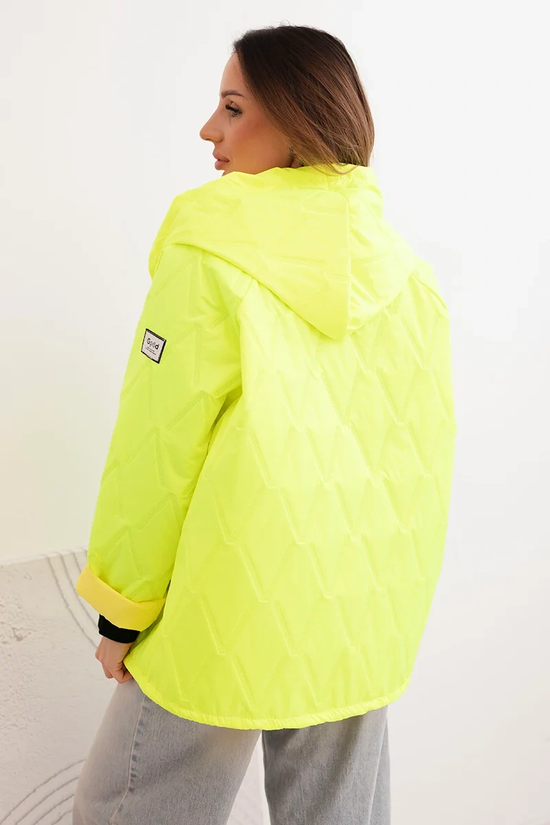 Kurtka damska wiosenna pikowana z kapturem i zamkiem żółty neon Szukasz idealnej kurtki na przejściowe dni? Ta damska kurtka pikowana z kapturem to doskonały wybór dla kobiet, które cenią sobie styl, wygodę i funkcjonalność. Wykonana z lekkiego materiału, zapewnia komfort noszenia i ochronę przed chłodem, nie obciążając sylwetki. Nowoczesny pikowany wzór w geometryczny motyw dodaje całości modnego charakteru, a luźny krój sprawia, że kurtka świetnie leży na każdej figurze.