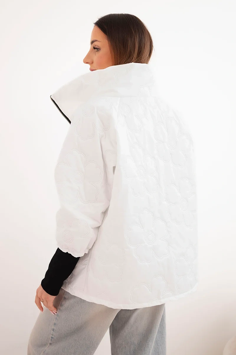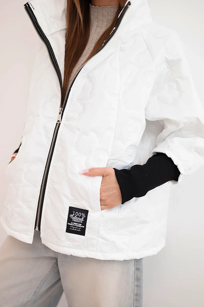 Kurtka damska wiosenna pikowana z ozdobnym tłoczeniem i zamkiem biała stylowa kurtka damska o modnym, pikowanym wykończeniu to doskonały wybór dla kobiet, które cenią komfort oraz nowoczesny wygląd. Charakterystyczne tłoczenie w kształcie kwiatów nadaje kurtce wyjątkowego charakteru i sprawia, że wyróżnia się na tle klasycznych modeli. Krótszy fason sprawia, że kurtka świetnie układa się na sylwetce i doskonale sprawdzi się w codziennych stylizacjach.