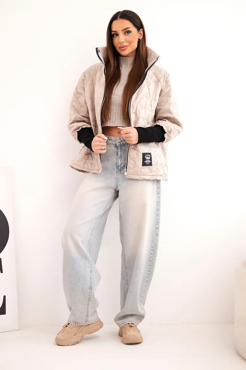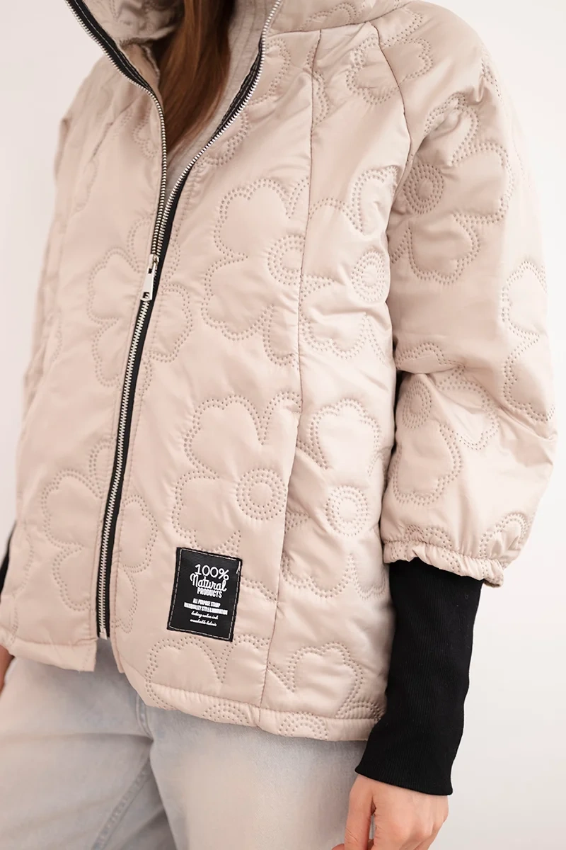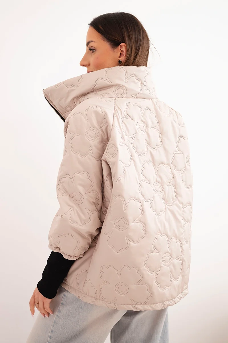 Kurtka damska wiosenna pikowana z ozdobnym tłoczeniem i zamkiem ciemno beżowa stylowa kurtka damska o modnym, pikowanym wykończeniu to doskonały wybór dla kobiet, które cenią komfort oraz nowoczesny wygląd. Charakterystyczne tłoczenie w kształcie kwiatów nadaje kurtce wyjątkowego charakteru i sprawia, że wyróżnia się na tle klasycznych modeli. Krótszy fason sprawia, że kurtka świetnie układa się na sylwetce i doskonale sprawdzi się w codziennych stylizacjach.