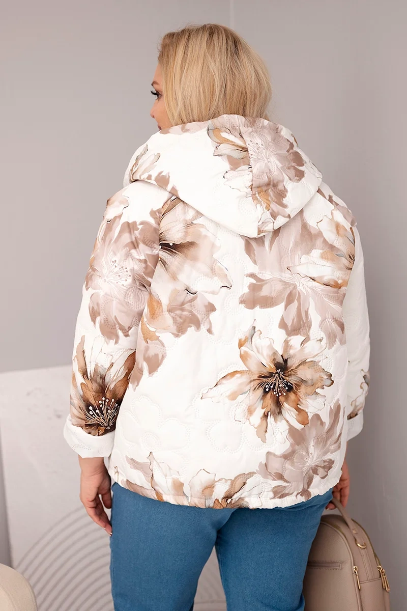 Kurtka damska wiosenna Plus Size z florystycznym wzorem fango Stylowa kurtka damska, która łączy w sobie wygodę i efektowny design! Pikowana faktura z delikatnym, kwiatowym wzorem sprawia, że całość wygląda bardzo kobieco i elegancko. Kurtka posiada praktyczny zamek oraz ściągacz u dołu, który pozwala dopasować ją do sylwetki. Kaptur zapewnia dodatkową ochronę przed chłodem, a lekka forma świetnie sprawdza się w codziennych stylizacjach – zarówno do jeansów, jak i sukienki. Idealna na sezon przejściowy.