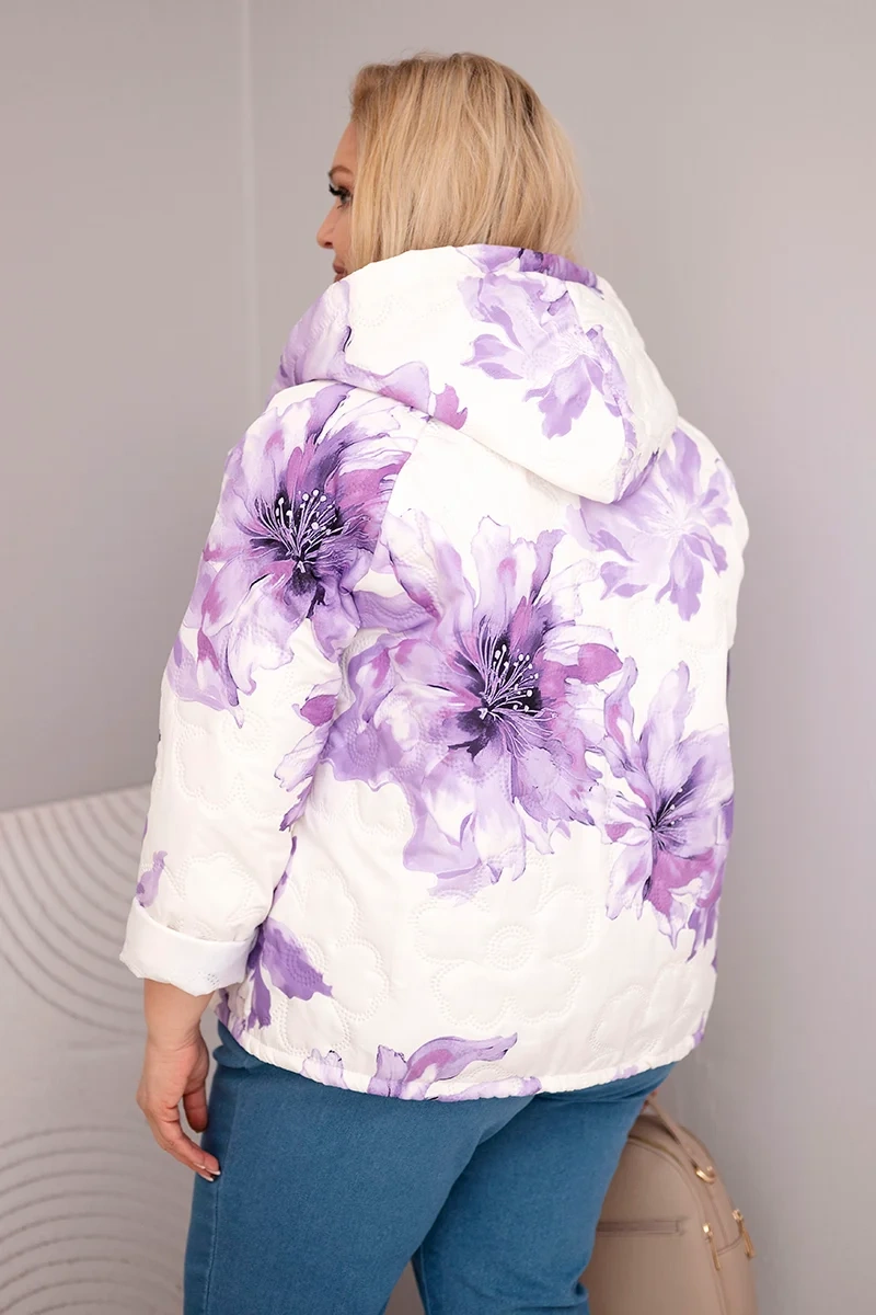 Kurtka damska wiosenna Plus Size z florystycznym wzorem fioletowa Stylowa kurtka damska, która łączy w sobie wygodę i efektowny design! Pikowana faktura z delikatnym, kwiatowym wzorem sprawia, że całość wygląda bardzo kobieco i elegancko. Kurtka posiada praktyczny zamek oraz ściągacz u dołu, który pozwala dopasować ją do sylwetki. Kaptur zapewnia dodatkową ochronę przed chłodem, a lekka forma świetnie sprawdza się w codziennych stylizacjach – zarówno do jeansów, jak i sukienki. Idealna na sezon przejściowy.