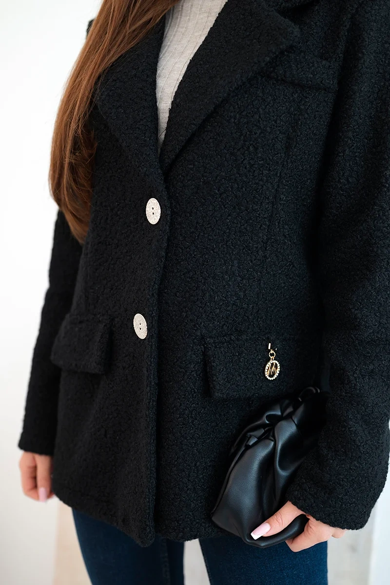 Kurtka damska z miękkiego baranka z kołnierzem czarna Stylowa i ciepła kurtka damska z miękkiego materiału typu “baranek” to doskonały wybór na chłodniejsze dni. Włoska produkcja gwarantuje dbałość o detale, a klasyczny fason z kołnierzem i dwurzędowym zapięciem dodaje całości eleganckiego charakteru. Kurtka posiada praktyczne kieszenie z ozdobnym detalem i złotymi guzikami, które podkreślają wyjątkowy styl tego modelu.