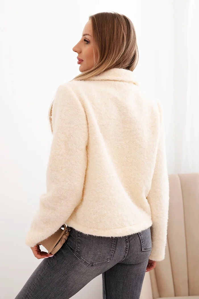 Kurtka damska z wełną o puszystej strukturze i ozdobnymi guzikami ecru Stylowa kurtka damska z domieszką wełny to idealne połączenie elegancji i wygody na chłodniejsze dni. Wykonana z miękkiego materiału o delikatnie puszystej fakturze prezentuje się bardzo efektownie, a jednocześnie jest niezwykle komfortowa w noszeniu. Klasyczny kołnierz, dekoracyjne kieszenie z klapami oraz złote guziki dodają jej szyku i nowoczesnego charakteru.