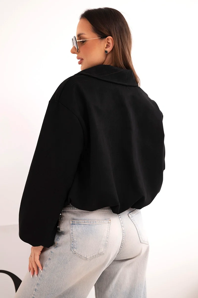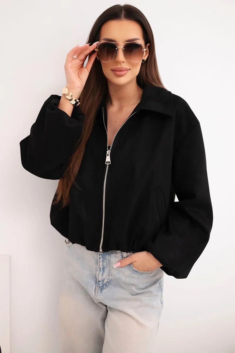 Kurtka damska z zamkiem i bufiastym rękawem czarna Ta krótka kurtka damska z zamkiem błyskawicznym i klasycznym kołnierzykiem to idealne połączenie stylu i wygody. Wykonana z miękkiego, lekko elastycznego materiału, świetnie dopasowuje się do sylwetki i zapewnia pełen komfort podczas noszenia.