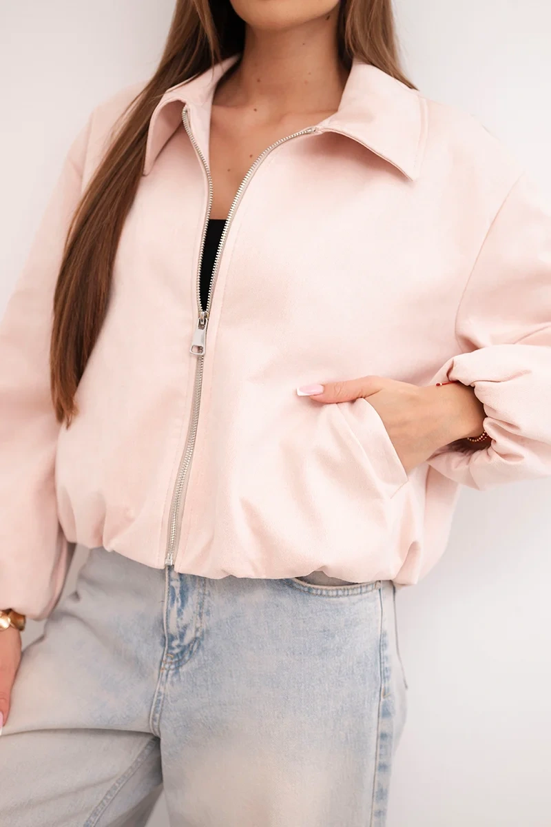 Kurtka damska z zamkiem i bufiastym rękawem pudrowy róż Ta krótka kurtka damska z zamkiem błyskawicznym i klasycznym kołnierzykiem to idealne połączenie stylu i wygody. Wykonana z miękkiego, lekko elastycznego materiału, świetnie dopasowuje się do sylwetki i zapewnia pełen komfort podczas noszenia.