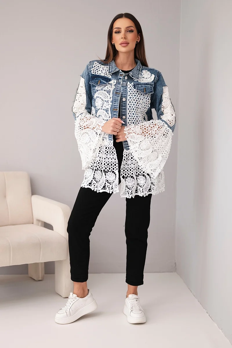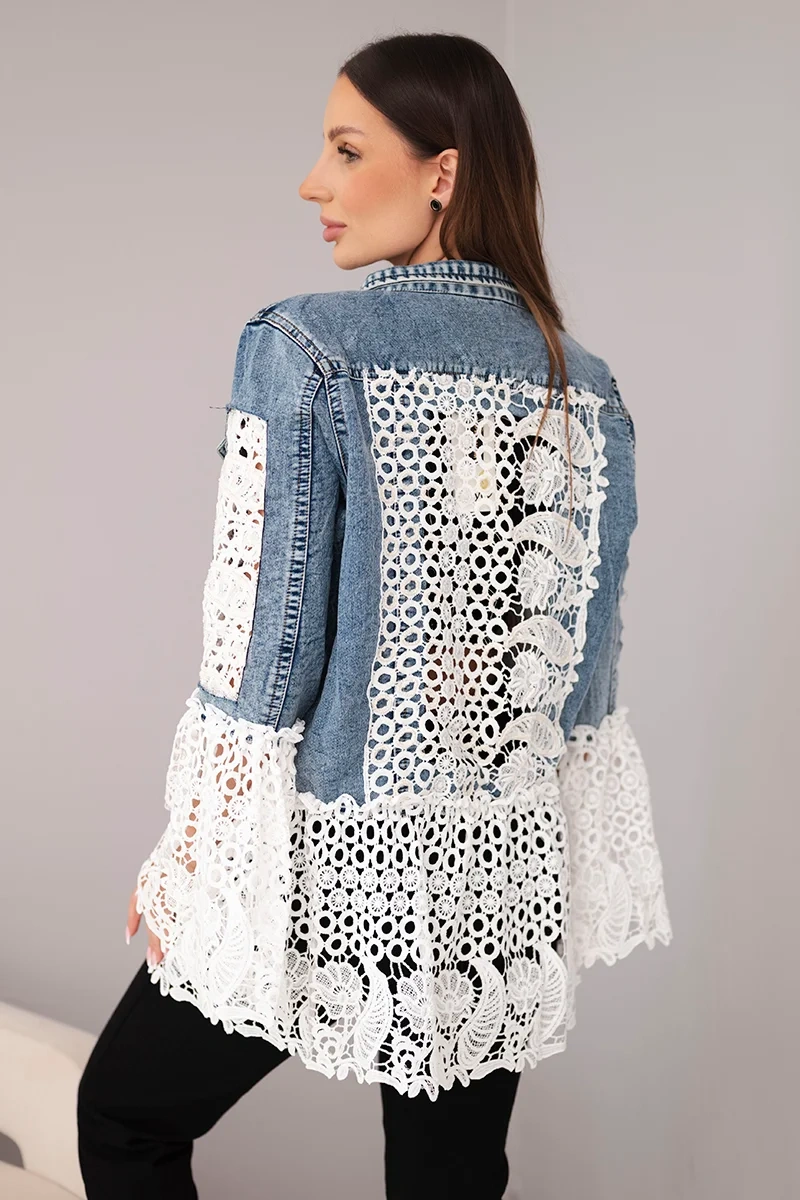 Jeśli szukasz oryginalnej i efektownej kurtki, która podkreśli Twój indywidualny styl – ta propozycja to must-have! Kurtka jeansowa damska została wzbogacona o bogato zdobione koronkowe wstawki oraz długie frędzle, które tworzą wyjątkowy, boho look. Połączenie klasycznego, niebieskiego denimu z romantyczną koronką sprawia, że kurtka idealnie łączy w sobie luz i kobiecy wdzięk.