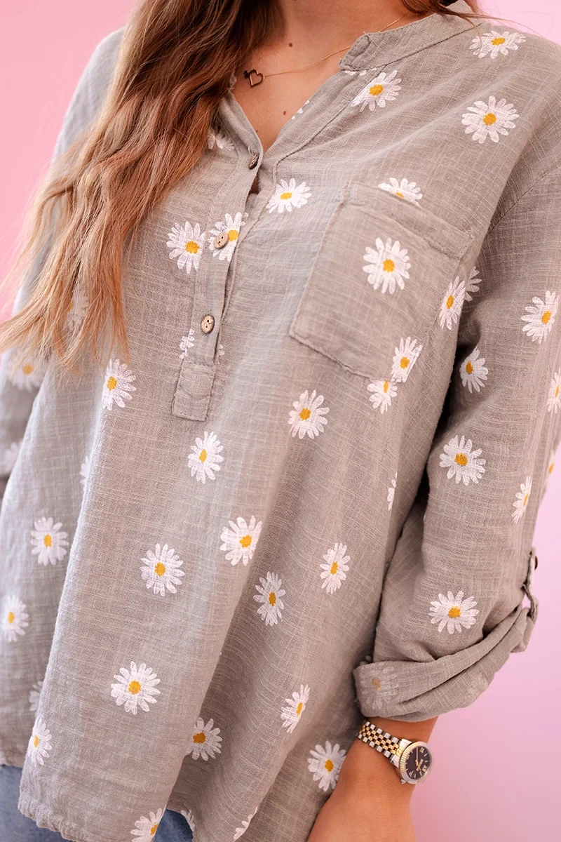 Lniana damska bluzka w kwiaty z długim rękawem i guzikami cappuccino Szukasz stylowej, wygodnej i uniwersalnej bluzki? Ta bluzka koszulowa w stokrotki to idealny wybór na każdą okazję! Wykonana z lekkiego, przewiewnego materiału, doskonale sprawdzi się wiosną i latem. Luźny krój zapewnia swobodę ruchów, a subtelny kwiatowy print dodaje kobiecego wdzięku. Długie rękawy z możliwością podpięcia pozwalają na różne sposoby noszenia, dopasowując się do Twojego stylu.