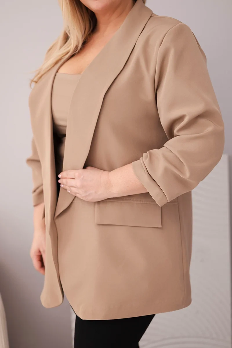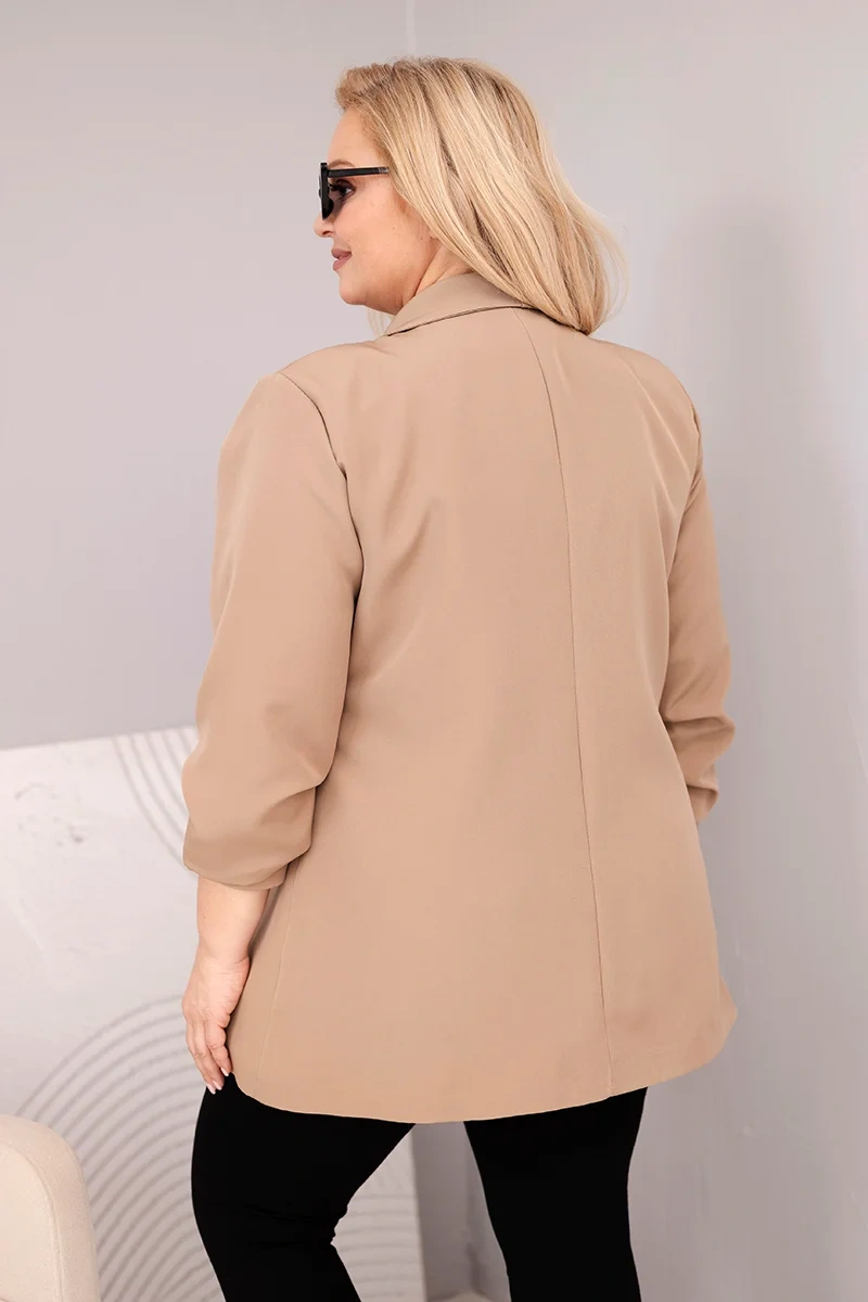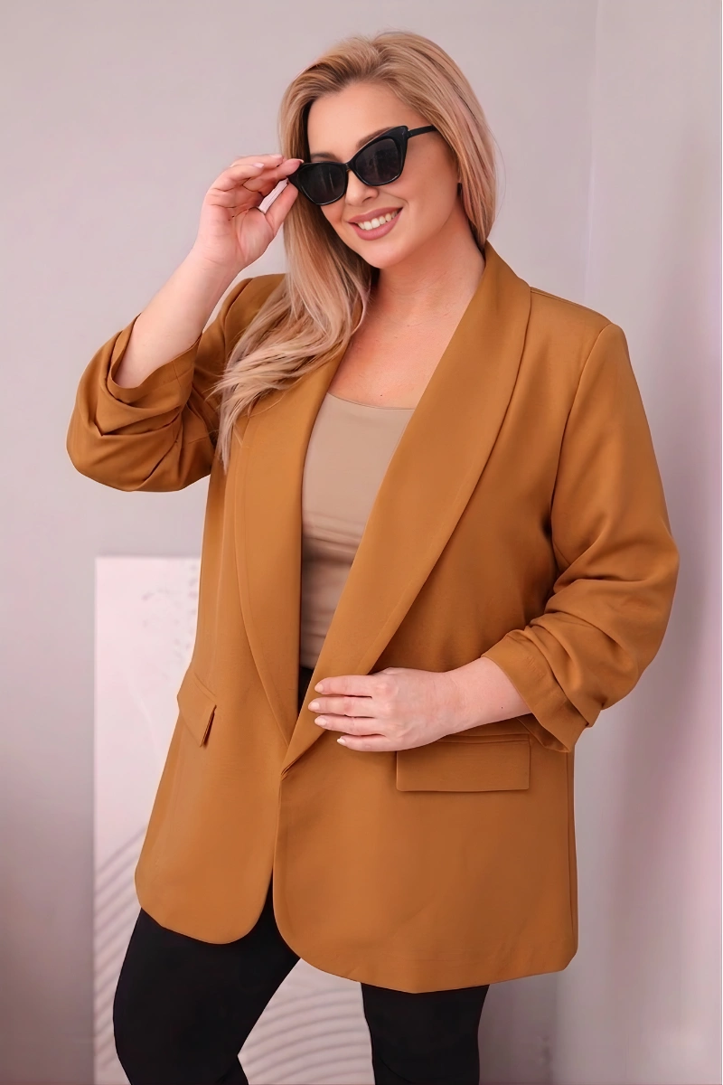 Marynarka damska Plus Size elegancka ciemno camelowa Stylowa marynarka damska plus size to propozycja dla kobiet, które lubią wyglądać elegancko i czuć się komfortowo jednocześnie. Fason typu oversize zapewnia swobodę ruchów, a dzięki długości sięgającej za biodra, model pięknie układa się na sylwetce, podkreślając jej atuty.