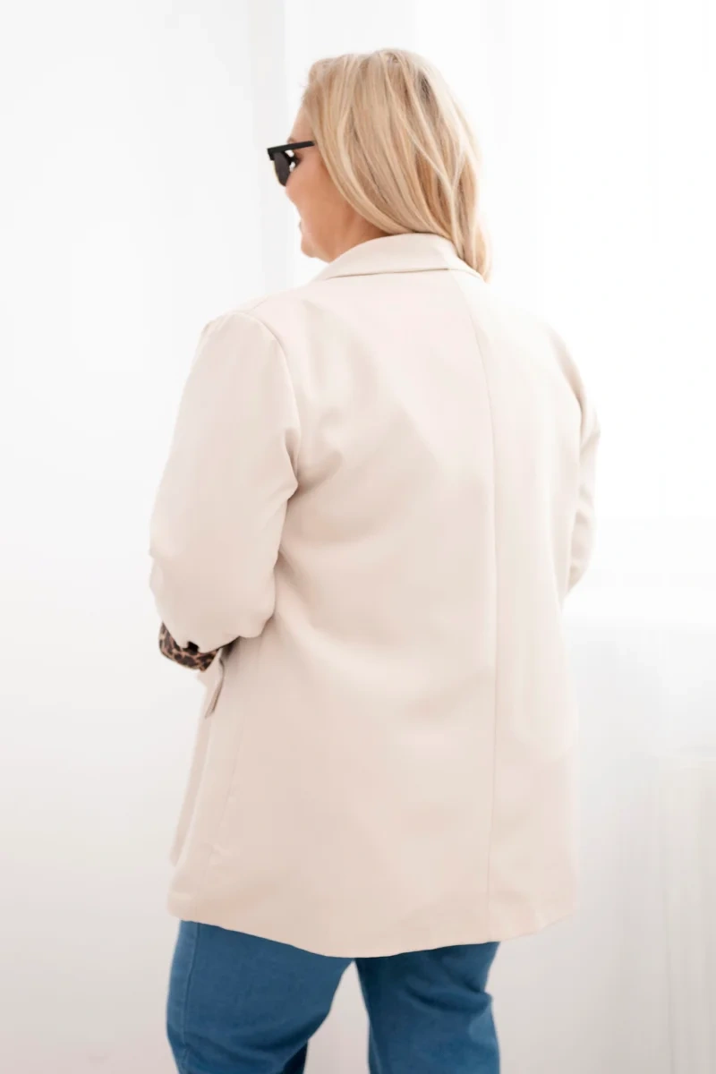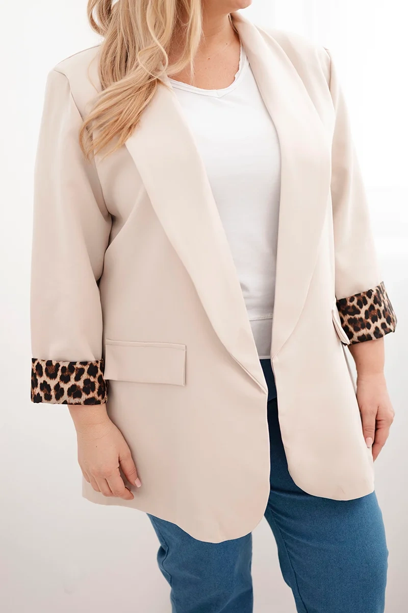 Marynarka damska Plus Size z podszewką w panterkę beżowa Ta stylowa marynarka damska to idealne połączenie klasyki i modowego pazura. Dzięki luźnemu krojowi i długości do bioder świetnie dopasowuje się do sylwetki, zapewniając komfort przez cały dzień. Największym atutem jest efektowna podszewka w panterkę, która dodaje odważnego charakteru – wystarczy lekko podwinąć rękawy, aby odkryć ten modny detal.