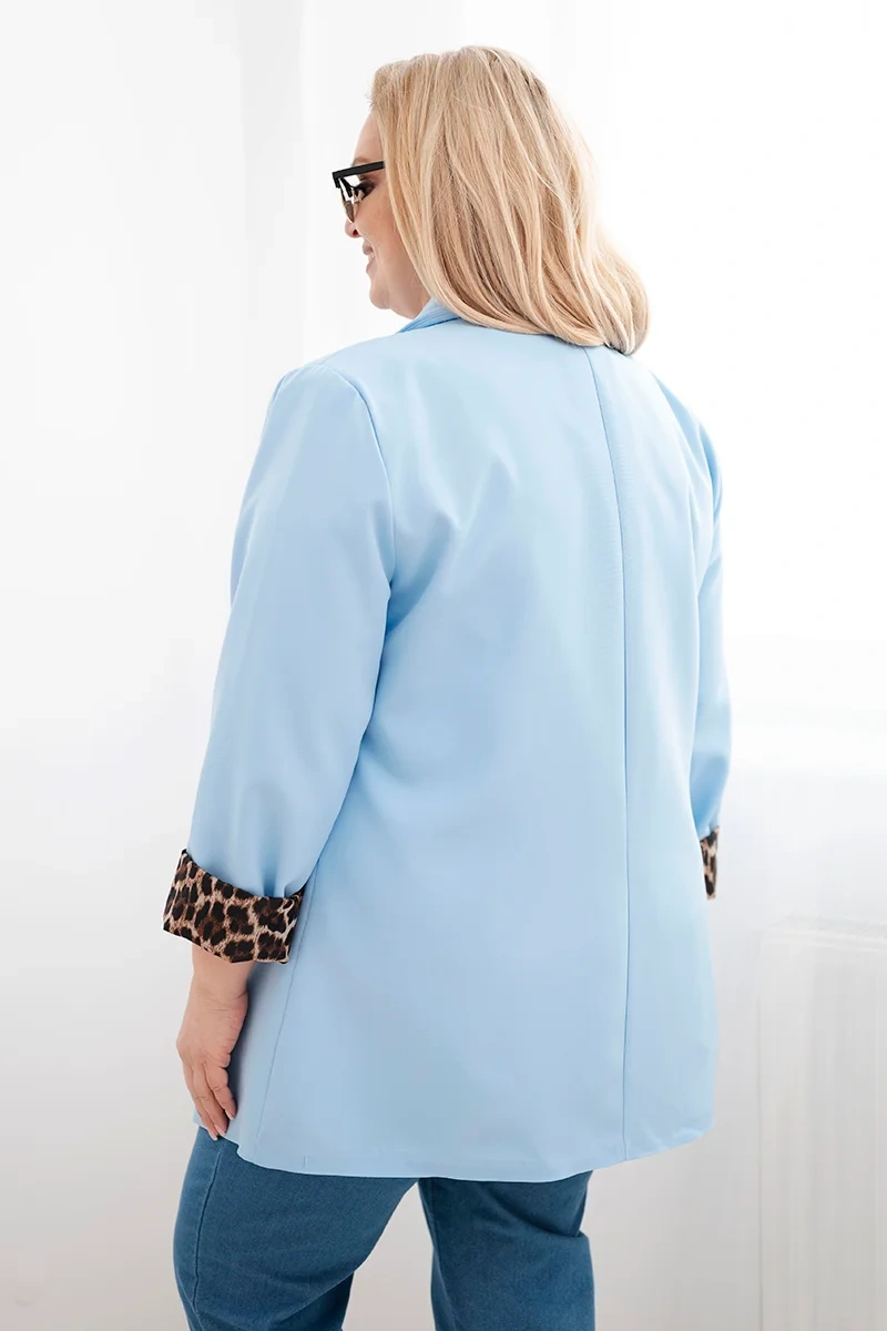 Marynarka damska Plus Size z podszewką w panterkę niebieska Ta stylowa marynarka damska to idealne połączenie klasyki i modowego pazura. Dzięki luźnemu krojowi i długości do bioder świetnie dopasowuje się do sylwetki, zapewniając komfort przez cały dzień. Największym atutem jest efektowna podszewka w panterkę, która dodaje odważnego charakteru – wystarczy lekko podwinąć rękawy, aby odkryć ten modny detal.