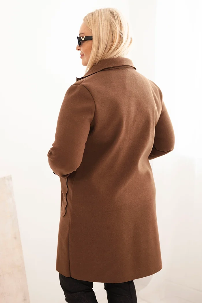 Płaszcz damski elegancki Plus Size z kołnierzem i dużymi kieszeniami czekoladowy Ten klasyczny płaszcz damski Plus Size to ponadczasowa propozycja dla kobiet ceniących prostotę, elegancję i komfort. Model wykonany z przyjemnego w dotyku materiału o jednolitej strukturze, posiada dwurzędowe zapięcie na guziki, szeroki kołnierz oraz praktyczne, duże kieszenie z ozdobną naszywką. Luźny, prosty fason świetnie układa się na sylwetce i zapewnia swobodę ruchów.