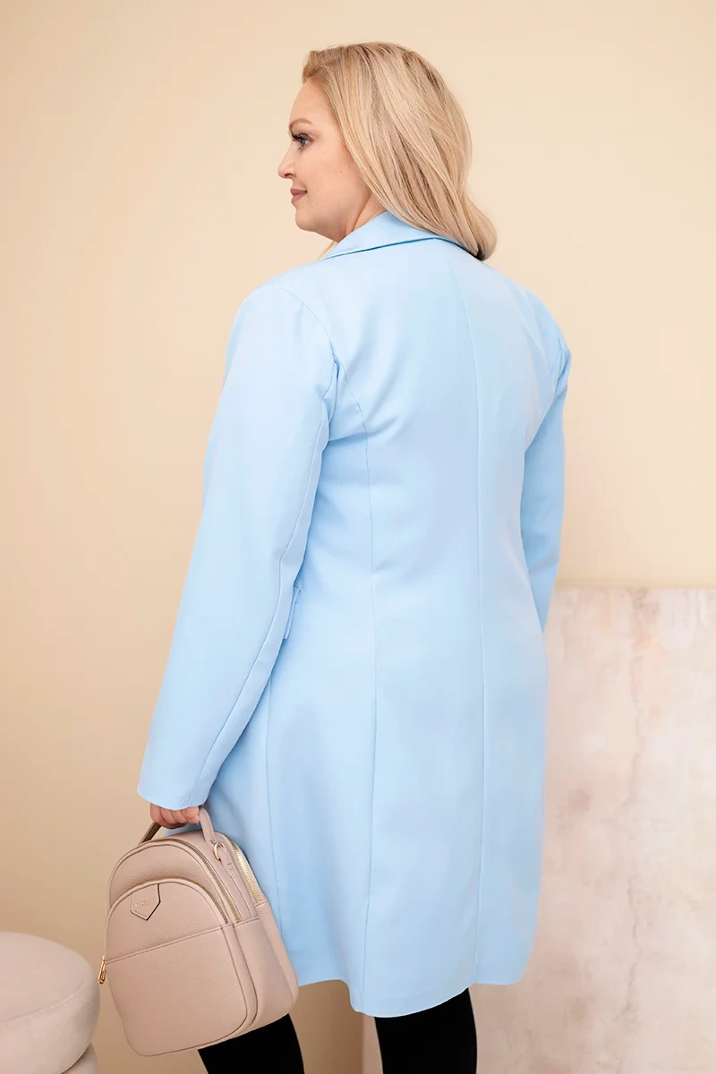 Płaszcz damski Plus Size długi z kołnierzem i kieszeniami niebieski Stylowy, długi płaszcz damski o klasycznym kroju to doskonały wybór dla kobiet, które cenią elegancję i komfort na co dzień. Model zapinany na guziki, z wyrazistym kołnierzem i kieszeniami z patkami, idealnie sprawdzi się jako uzupełnienie zarówno eleganckich, jak i casualowych stylizacji. Długość za biodra oraz lekko elastyczny materiał gwarantują wygodę i swobodę ruchu. Idealny na sezon przejściowy – do pracy, na miasto czy na wyjątkowe okazje.