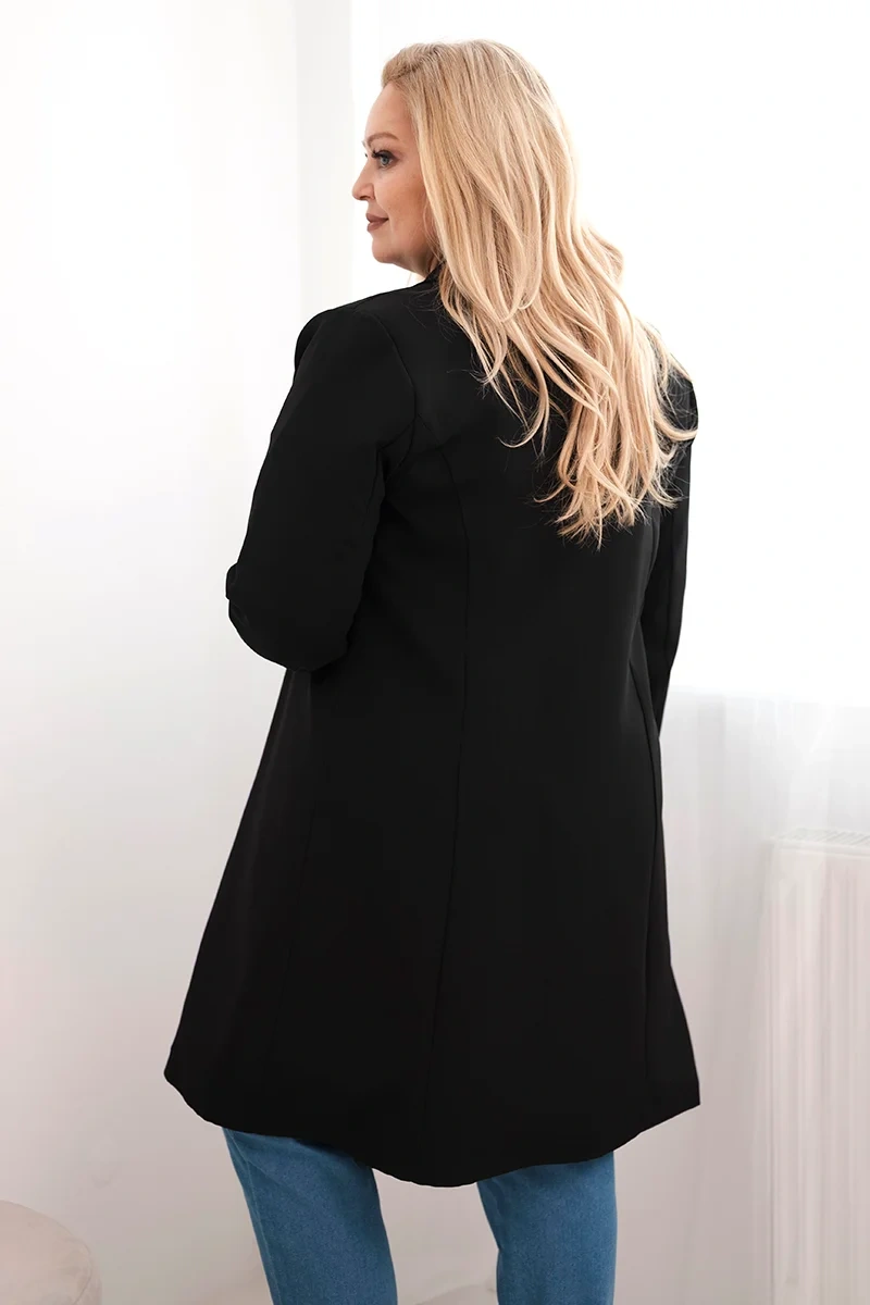 Płaszcz damski Plus Size dwurzędowy z kołnierzem czarny to idealna propozycja dla kobiet ceniących szyk i uniwersalność. Klasyczny fason z dwurzędowym zapięciem na guziki oraz wyraźnie zaznaczonym kołnierzem sprawia, że płaszcz prezentuje się wyjątkowo stylowo. Dzięki lekko elastycznemu materiałowi dobrze dopasowuje się do sylwetki, a długość do kolan nadaje mu ponadczasowego charakteru. Sprawdzi się świetnie zarówno do codziennych stylizacji, jak i na bardziej formalne okazje – do pracy, na spotkanie czy spacer po mieście.