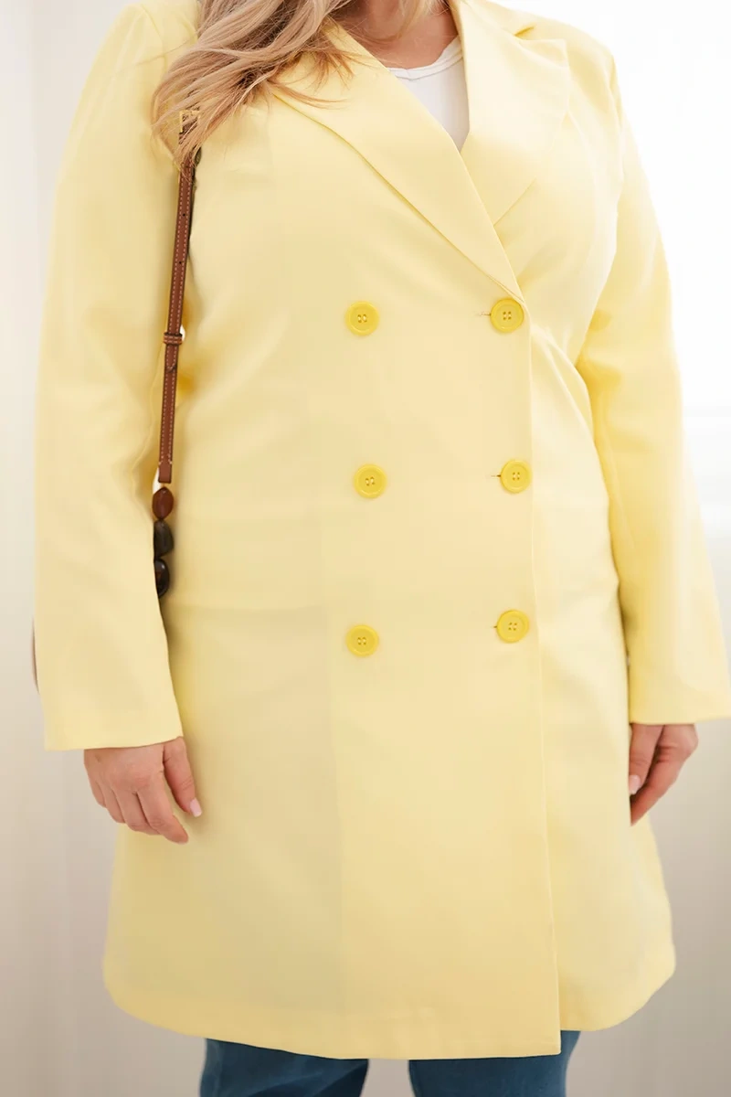 Płaszcz damski Plus Size dwurzędowy z kołnierzem żółty Ten elegancki płaszcz damski to idealna propozycja dla kobiet ceniących szyk i uniwersalność. Klasyczny fason z dwurzędowym zapięciem na guziki oraz wyraźnie zaznaczonym kołnierzem sprawia, że płaszcz prezentuje się wyjątkowo stylowo. Dzięki lekko elastycznemu materiałowi dobrze dopasowuje się do sylwetki, a długość do kolan nadaje mu ponadczasowego charakteru. Sprawdzi się świetnie zarówno do codziennych stylizacji, jak i na bardziej formalne okazje – do pracy, na spotkanie czy spacer po mieście.