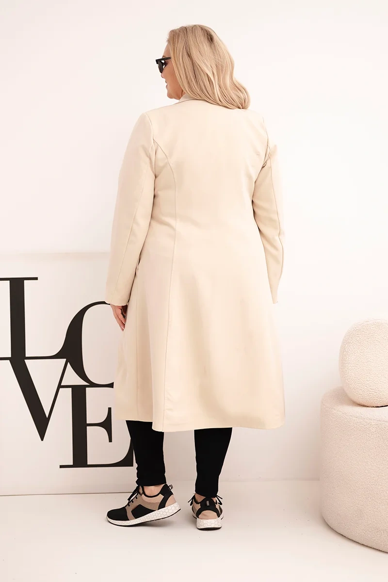 Płaszcz damski Plus Size klasyczny z guzikami i kołnierzem beżowy Ten elegancki płaszcz damski o prostym, klasycznym kroju to idealny wybór na chłodniejsze dni. Model z wyraźnie zaznaczonym kołnierzem i zapięciem na guziki prezentuje się bardzo stylowo i ponadczasowo. Dzięki długości za kolano oraz luźniejszemu fasonowi, zapewnia komfort noszenia i pasuje do różnych typów sylwetek. Lekko elastyczny materiał dobrze układa się na ciele, a wewnętrzna podszewka zwiększa wygodę użytkowania. Doskonały do pracy, na spacer czy eleganckie wyjścia.