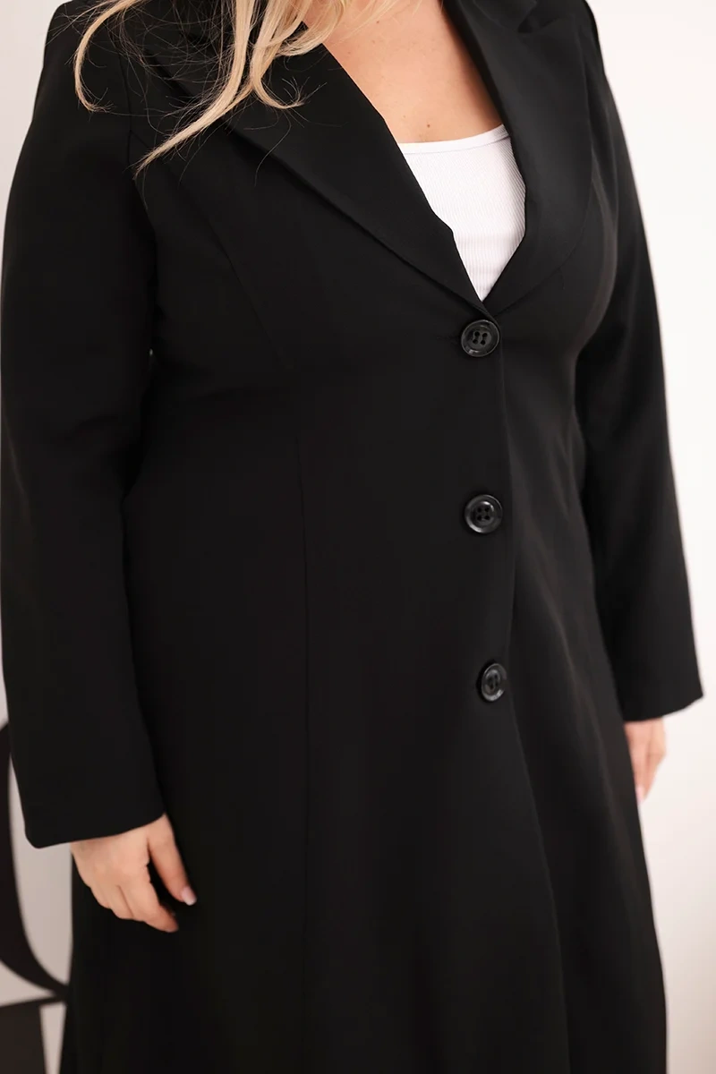 Płaszcz damski Plus Size klasyczny z guzikami i kołnierzem czarny Ten elegancki płaszcz damski o prostym, klasycznym kroju to idealny wybór na chłodniejsze dni. Model z wyraźnie zaznaczonym kołnierzem i zapięciem na guziki prezentuje się bardzo stylowo i ponadczasowo. Dzięki długości za kolano oraz luźniejszemu fasonowi, zapewnia komfort noszenia i pasuje do różnych typów sylwetek. Lekko elastyczny materiał dobrze układa się na ciele, a wewnętrzna podszewka zwiększa wygodę użytkowania. Doskonały do pracy, na spacer czy eleganckie wyjścia.