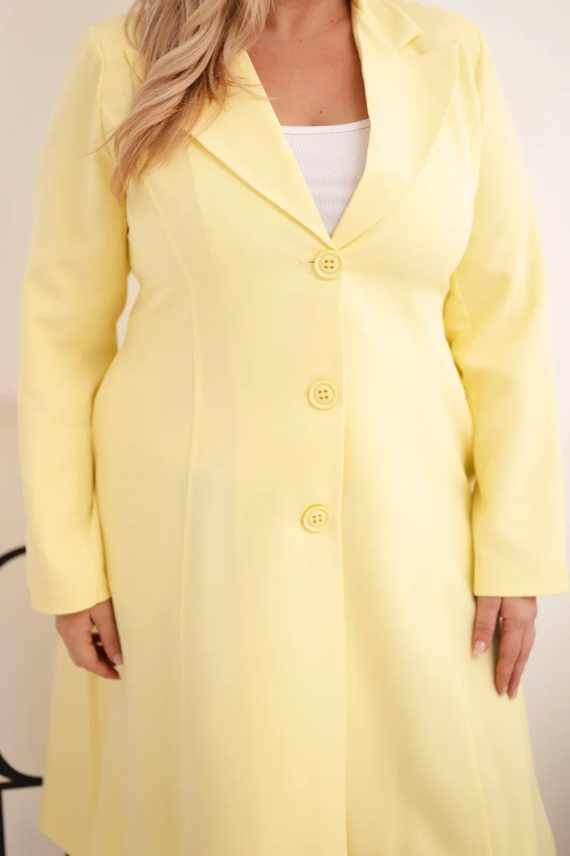 Płaszcz damski Plus Size klasyczny z guzikami i kołnierzem żółty Ten elegancki płaszcz damski o prostym, klasycznym kroju to idealny wybór na chłodniejsze dni. Model z wyraźnie zaznaczonym kołnierzem i zapięciem na guziki prezentuje się bardzo stylowo i ponadczasowo. Dzięki długości za kolano oraz luźniejszemu fasonowi, zapewnia komfort noszenia i pasuje do różnych typów sylwetek. Lekko elastyczny materiał dobrze układa się na ciele, a wewnętrzna podszewka zwiększa wygodę użytkowania. Doskonały do pracy, na spacer czy eleganckie wyjścia.