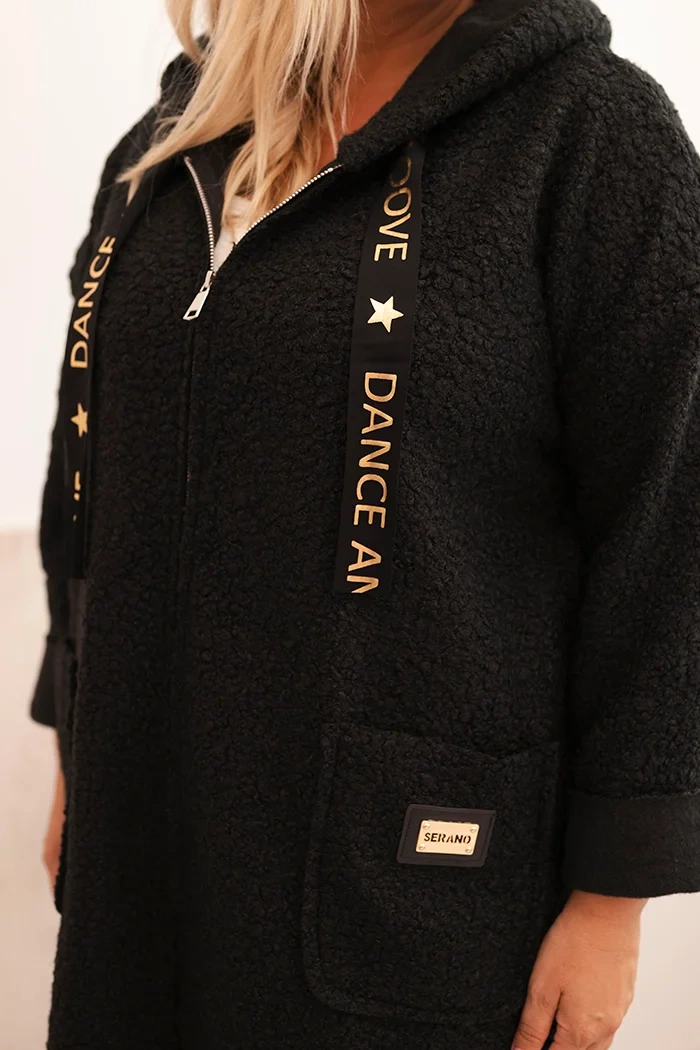 Płaszcz damski Plus Size ze sztucznego baranka z kapturem i kieszeniami czarny Przytulna bluza damska Plus Size o fasonie oversize to idealny wybór na chłodniejsze dni. Wykonana z miękkiego, ciepłego materiału o strukturze „baranka”, zapewnia komfort noszenia i modny, swobodny look. Bluza posiada praktyczny kaptur z ozdobnymi trokami, duże kieszenie z przodu oraz zamek błyskawiczny ułatwiający zakładanie.