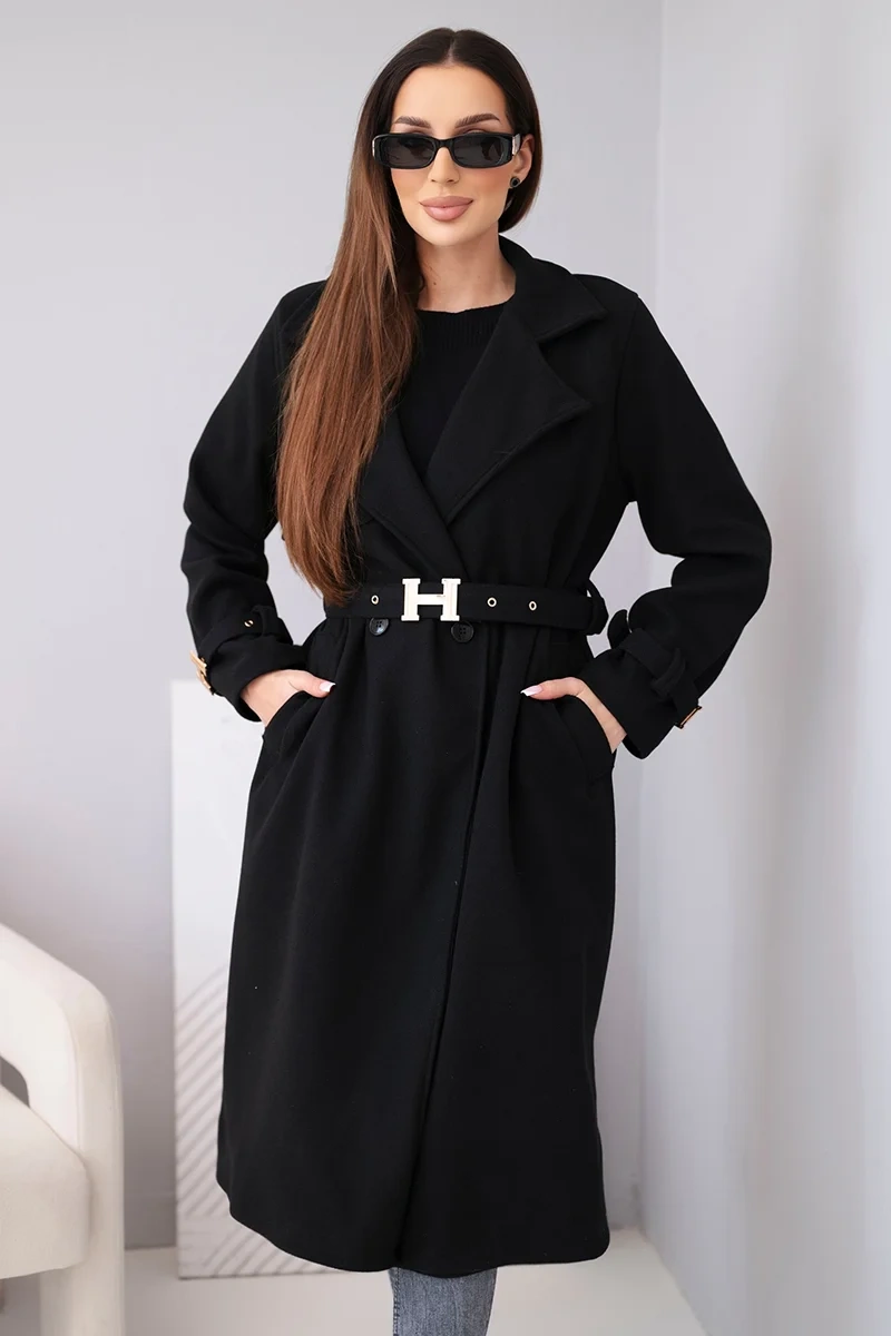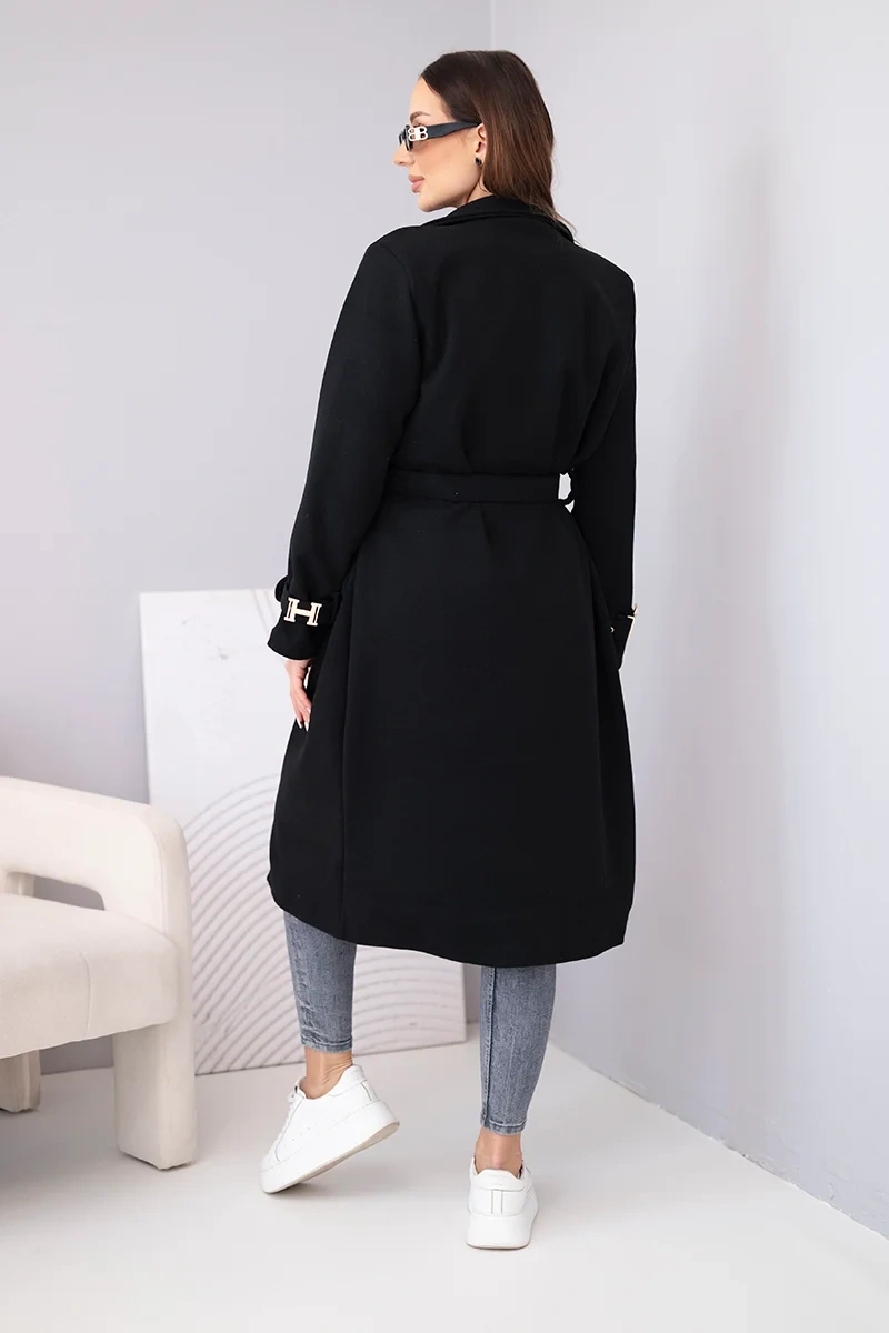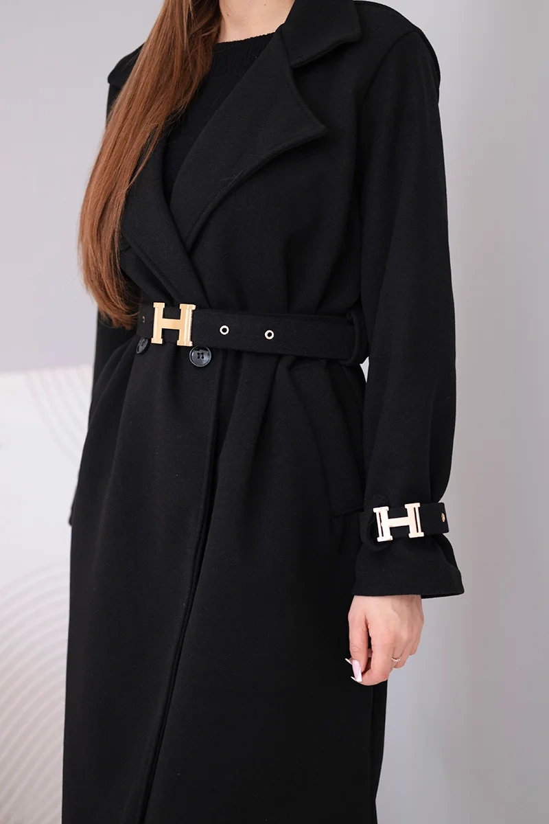 Płaszcz damski z paskiem i złotymi klamrami czarny Elegancki płaszcz damski z paskiem to wyjątkowa propozycja dla kobiet ceniących styl i ponadczasową klasykę. Model o długości midi pięknie podkreśla sylwetkę, a dołączony pasek z ozdobną złotą klamrą nadaje całości luksusowego charakteru.