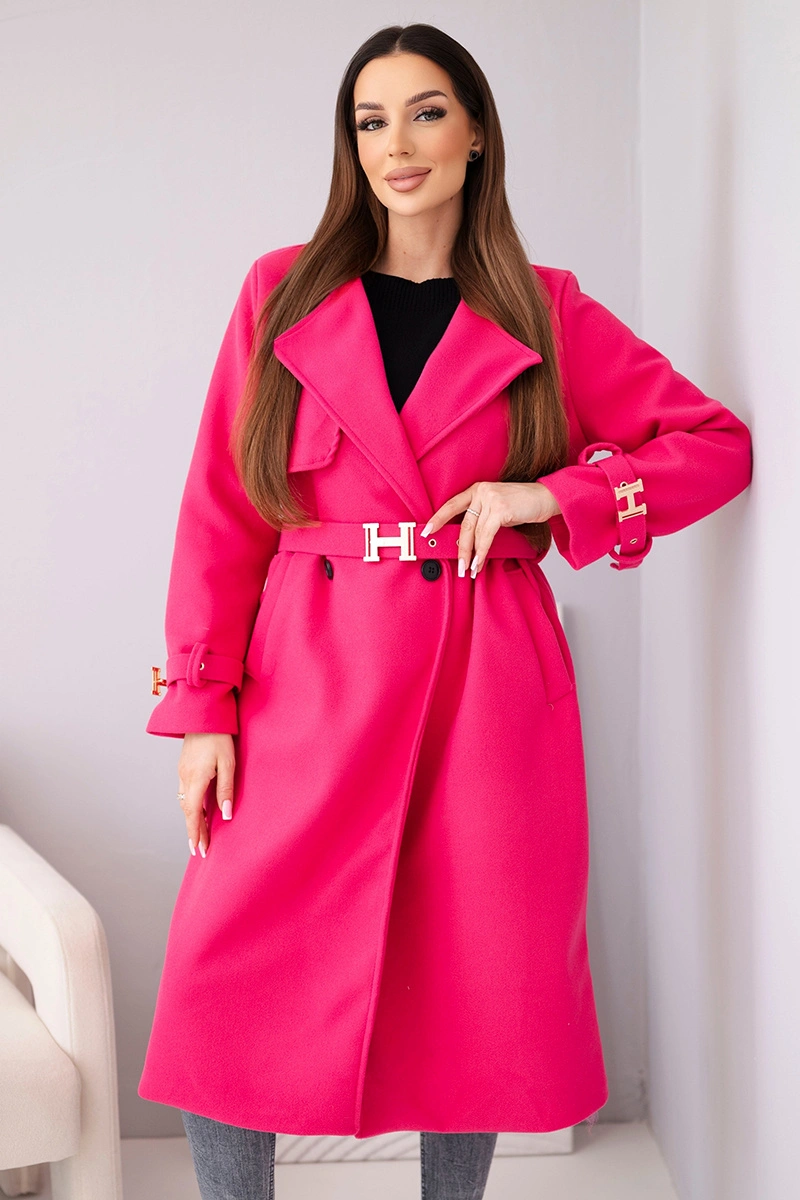 Płaszcz damski z paskiem i złotymi klamrami fuksja