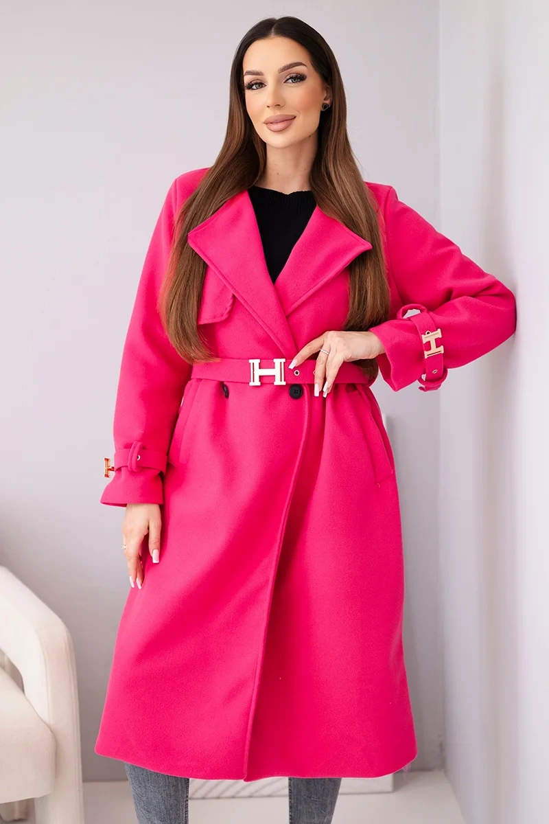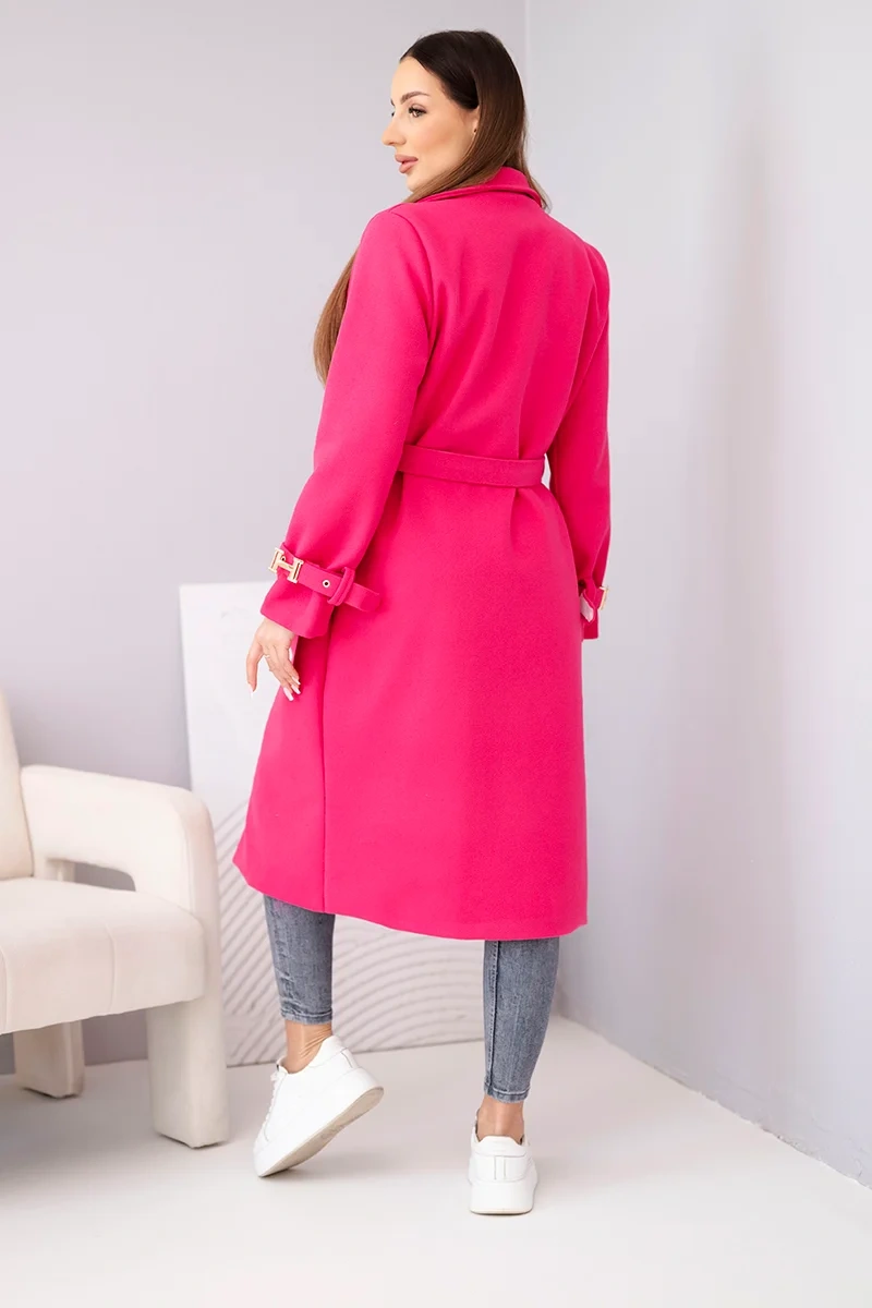 Płaszcz damski z paskiem i złotymi klamrami fuksja Elegancki płaszcz damski z paskiem to wyjątkowa propozycja dla kobiet ceniących styl i ponadczasową klasykę. Model o długości midi pięknie podkreśla sylwetkę, a dołączony pasek z ozdobną złotą klamrą nadaje całości luksusowego charakteru.