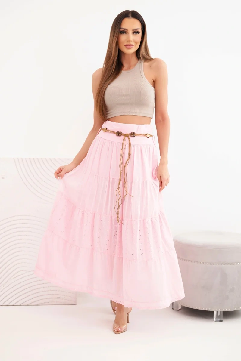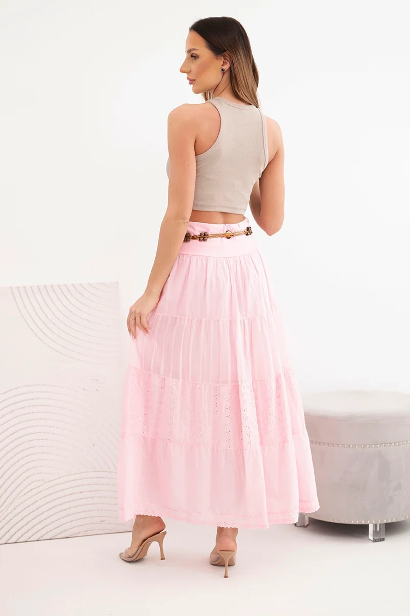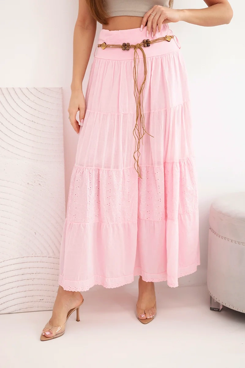 Spódnica damska maxi bawełniana z ażurowym haftem i elastycznym pasem cukierkowy róż