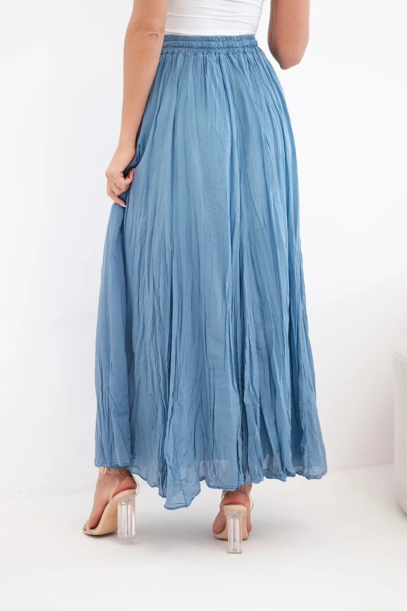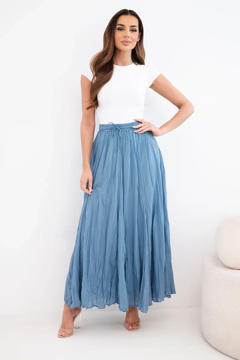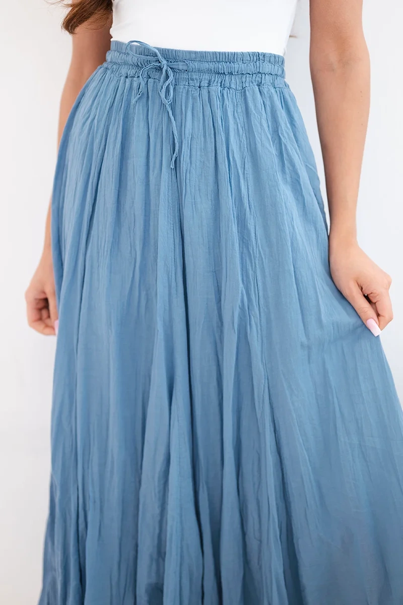 Spódnica damska maxi bawełniana z gumką w pasie jeansowa Zwiewna spódnica damska maxi to idealna propozycja na ciepłe dni. Model wykonany w 100% z bawełny jest lekki, przewiewny i bardzo komfortowy w noszeniu. Delikatnie marszczony materiał nadaje spódnicy modnego, naturalnego charakteru oraz pięknie układa się podczas ruchu.
