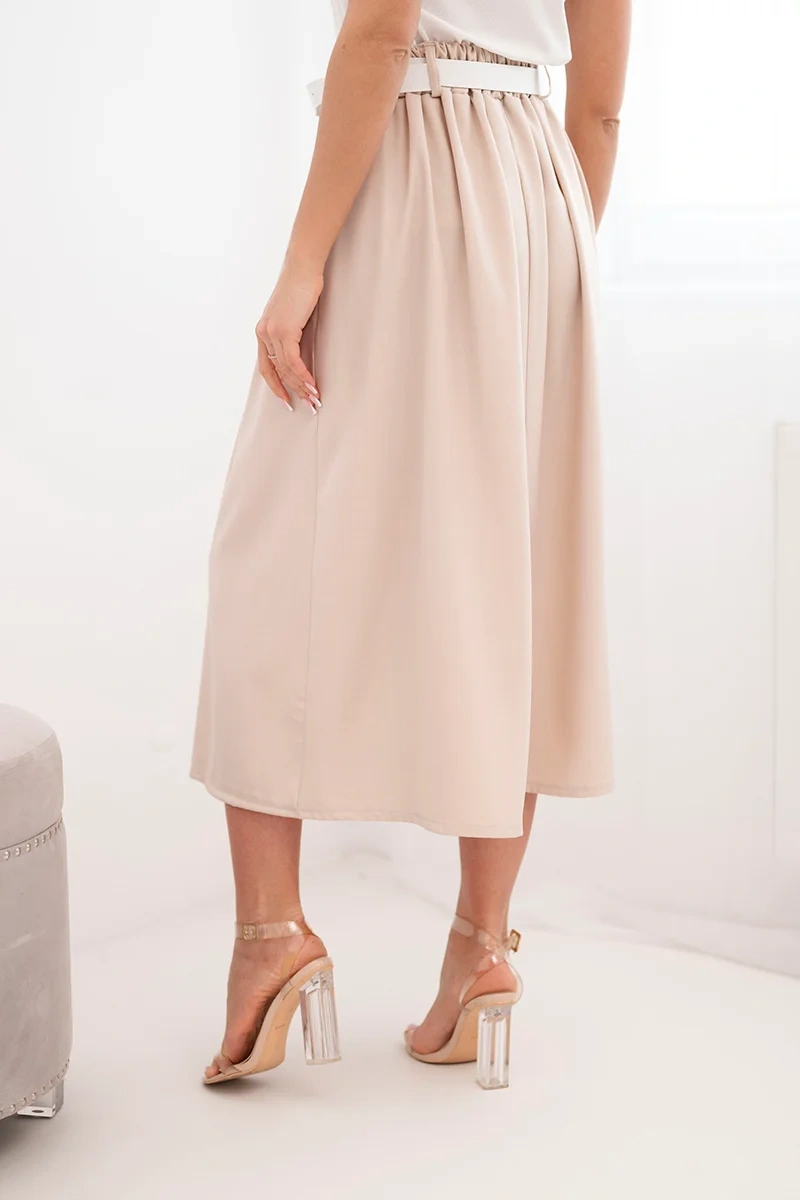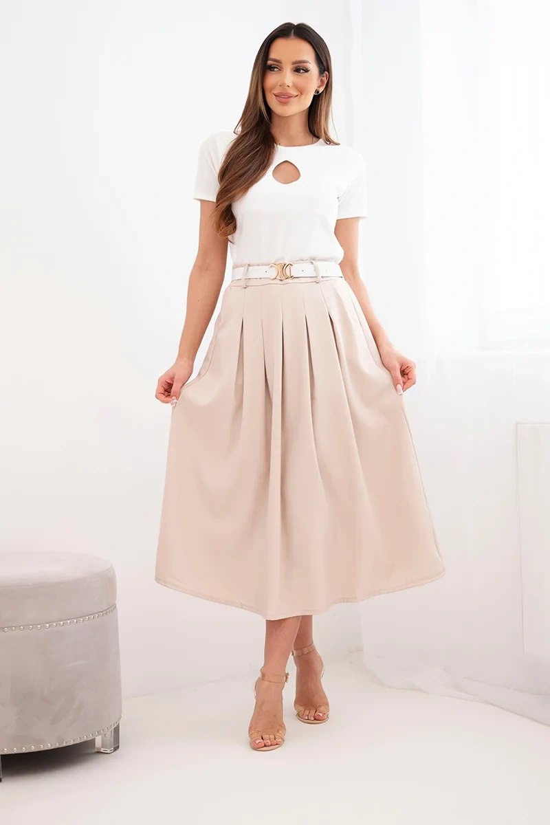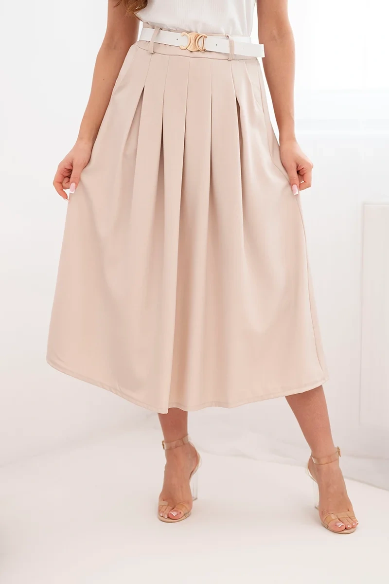 Spódnica damska wiskozowa z paskiem i zakładkami ciemno beżowa Spódnica damska midi to ponadczasowa propozycja dla kobiet, które cenią elegancję i wygodę w jednym. Model o rozkloszowanym fasonie z efektownymi zakładkami pięknie układa się w ruchu i subtelnie podkreśla sylwetkę. Elastyczna talia zapewnia komfort noszenia oraz idealne dopasowanie do figury.