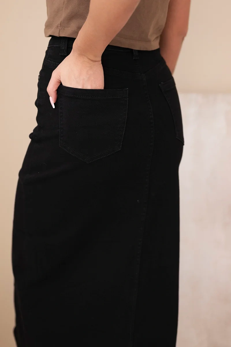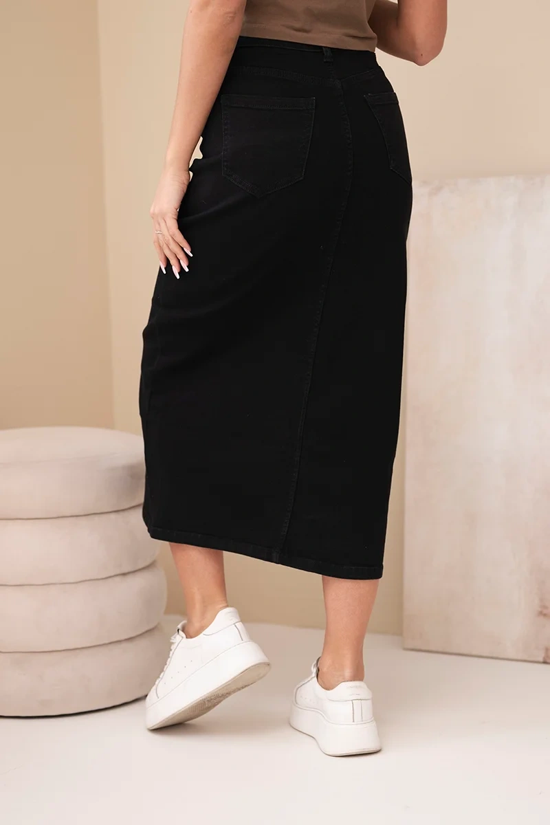 Spódnica jeansowa damska midi z wysokim stanem to stylowa propozycja dla kobiet, które cenią klasyczne kroje i wygodę na co dzień. Fason o długości midi pięknie modeluje sylwetkę, podkreślając talię oraz biodra. Ciemny, jednolity denim dodaje elegancji, a jednocześnie sprawia, że spódnica jest niezwykle uniwersalna – idealna zarówno do casualowych stylizacji, jak i bardziej kobiecych zestawów.