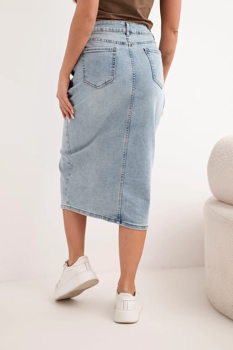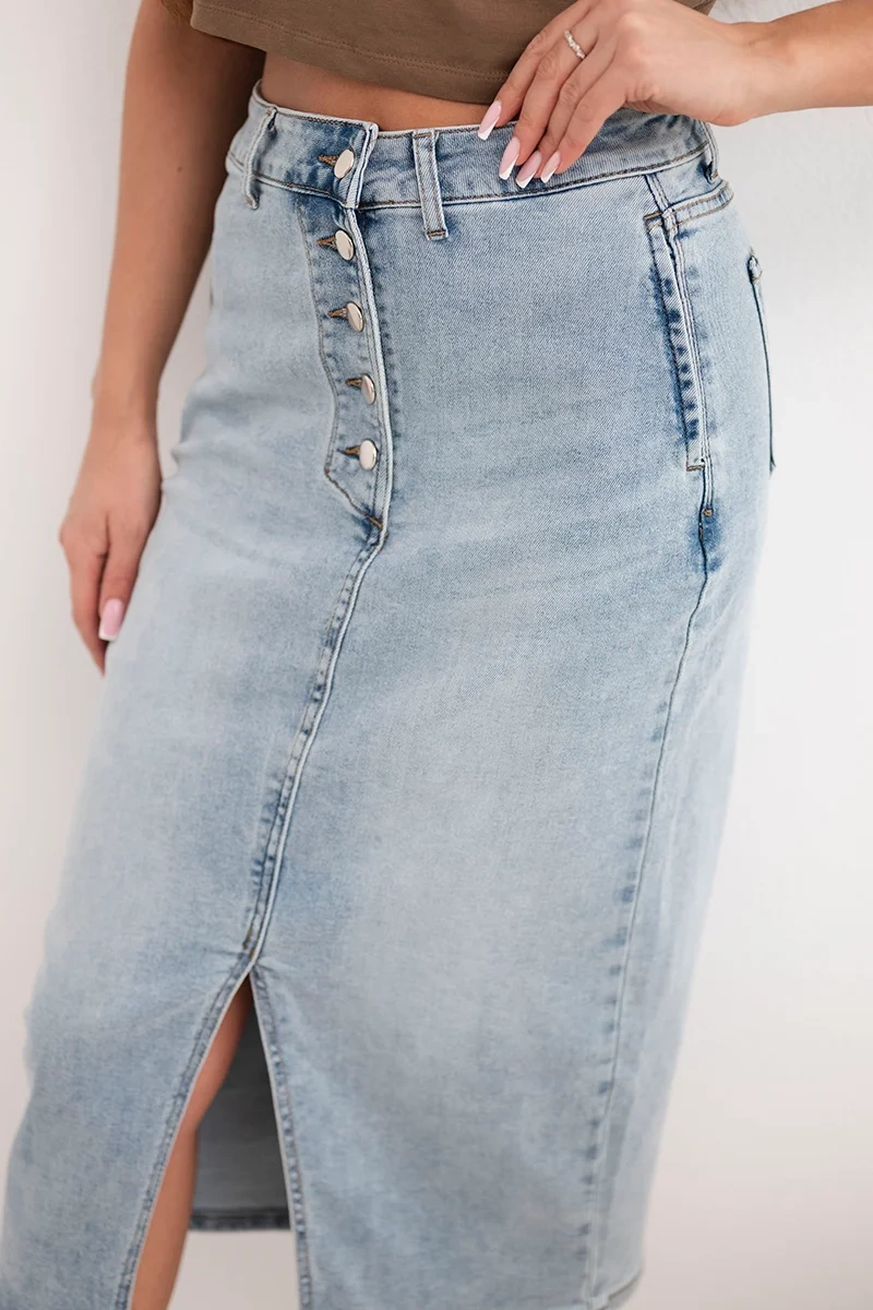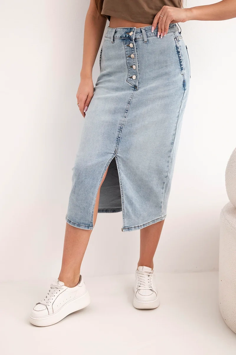 Spódnica jeansowa M.Sara z guzikami midi z elastycznego denimu jeansowe Spódnica jeansowa M.Sara model ME502-H to połączenie kobiecego fasonu midi z nowoczesnymi detalami. Wysoki stan oraz ozdobne złote guziki dodają jej charakteru, a elastyczny materiał doskonale dopasowuje się do sylwetki, zapewniając wygodę i podkreślenie figury.