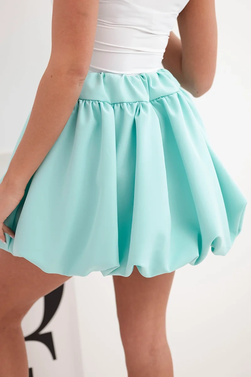Spódniczka damska wiskozowa bombka z gumką w pasie miętowa Jeśli szukasz niebanalnego dodatku do swojej garderoby, ta spódniczka damska o fasonie bombki będzie strzałem w dziesiątkę! Jej rozkloszowany krój z efektownym marszczeniem tworzy wyjątkowy i kobiecy wygląd, który świetnie podkreśla talię i dodaje sylwetce lekkości. Elastyczna talia gwarantuje idealne dopasowanie, a przyjemny w dotyku materiał zapewnia wygodę przez cały dzień. Doskonale sprawdzi się na co dzień, do pracy, a także na wyjątkowe okazje – wystarczy dodać odpowiednią górę i dodatki.