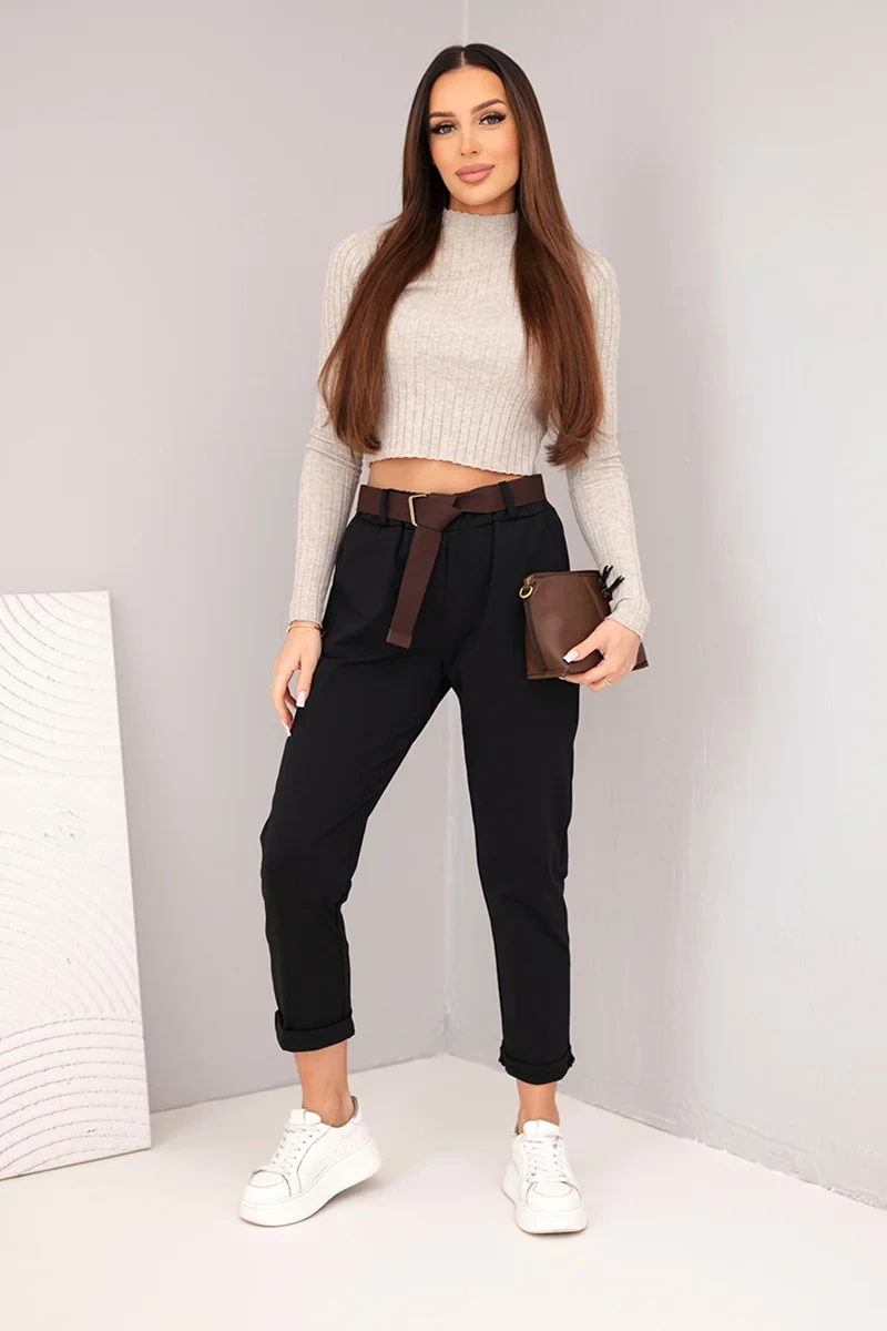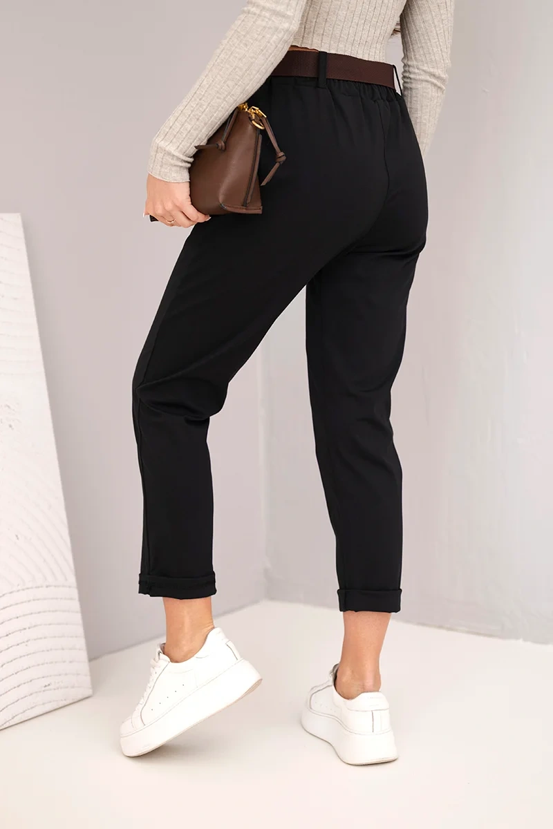 Spodnie damskie bawełniane z paskiem i podwijaną nogawką czarne Modne i wygodne spodnie damskie z paskiem to idealny wybór dla kobiet ceniących styl i komfort. Wykonane z wysokiej jakości materiału, zapewniają swobodę ruchów i doskonałe dopasowanie do sylwetki. Posiadają elastyczny pas oraz praktyczny pasek, który podkreśla talię. Ich klasyczny krój z podwiniętą nogawką sprawia, że pasują zarówno do codziennych, jak i bardziej eleganckich stylizacji. Świetnie sprawdzą się w zestawieniu z koszulą lub lekkim swetrem. Rozmiar jest uniwersalny i będzie odpowiedni dla Pań w rozmiarze S, M lub L.