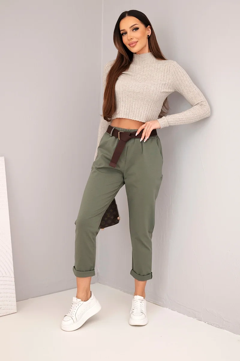 Spodnie damskie bawełniane z paskiem i podwijaną nogawką khaki Modne i wygodne spodnie damskie z paskiem to idealny wybór dla kobiet ceniących styl i komfort. Wykonane z wysokiej jakości materiału, zapewniają swobodę ruchów i doskonałe dopasowanie do sylwetki. Posiadają elastyczny pas oraz praktyczny pasek, który podkreśla talię. Ich klasyczny krój z podwiniętą nogawką sprawia, że pasują zarówno do codziennych, jak i bardziej eleganckich stylizacji. Świetnie sprawdzą się w zestawieniu z koszulą lub lekkim swetrem. Rozmiar jest uniwersalny i będzie odpowiedni dla Pań w rozmiarze S, M lub L.