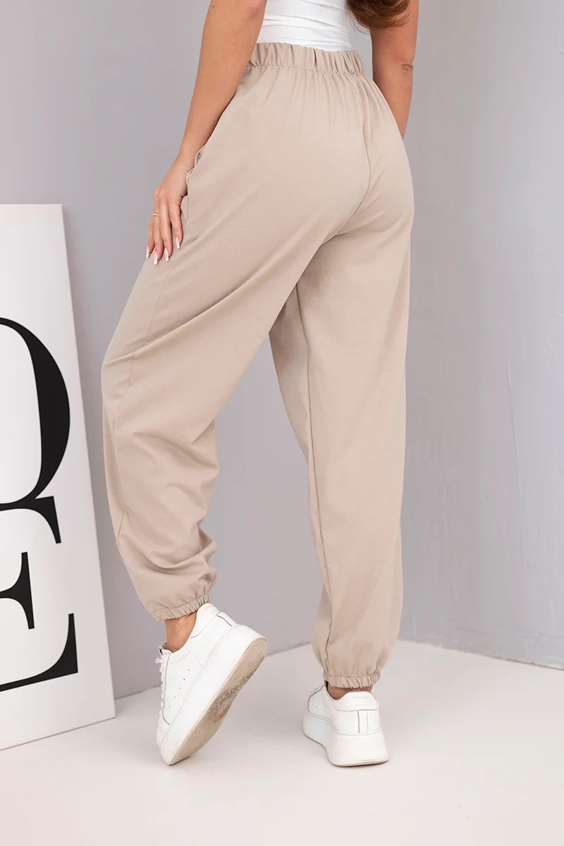 Spodnie damskie bawełniane z wysokim stanem i ozdobnym guzikiem ciemno beżowe Te eleganckie spodnie damskie z wysokim stanem to propozycja dla kobiet, które cenią sobie połączenie komfortu i stylu. Luźny fason z delikatnie zwężanymi nogawkami zakończonymi ściągaczem sprawia, że spodnie pięknie układają się na sylwetce i pasują do wielu stylizacji – zarówno codziennych, jak i bardziej eleganckich. Ozdobny guzik z przodu dodaje im uroku i klasycznego wykończenia. Świetnie komponują się z bluzkami, topami czy marynarkami, tworząc modny i kobiecy look.