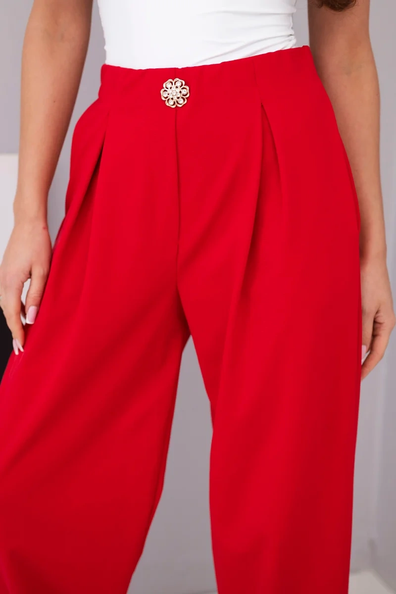 Spodnie damskie bawełniane z wysokim stanem i ozdobnym guzikiem czerwone Te eleganckie spodnie damskie z wysokim stanem to propozycja dla kobiet, które cenią sobie połączenie komfortu i stylu. Luźny fason z delikatnie zwężanymi nogawkami zakończonymi ściągaczem sprawia, że spodnie pięknie układają się na sylwetce i pasują do wielu stylizacji – zarówno codziennych, jak i bardziej eleganckich. Ozdobny guzik z przodu dodaje im uroku i klasycznego wykończenia. Świetnie komponują się z bluzkami, topami czy marynarkami, tworząc modny i kobiecy look.