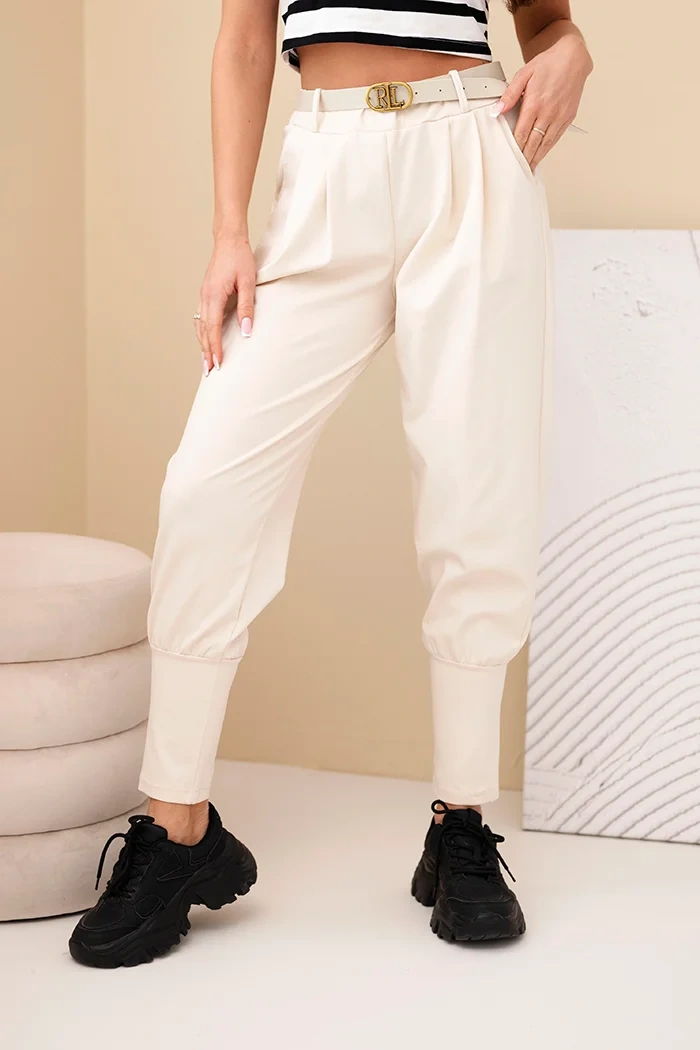 Spodnie damskie bawełniane z wysokim stanem i paskiem beżowa Szukasz wygodnych, a jednocześnie stylowych spodni na co dzień? Te spodnie damskie z wysokim stanem to idealne połączenie komfortu i modnego wyglądu. Dzięki elastycznej talii świetnie dopasowują się do sylwetki, a dołączony pasek z ozdobną klamrą dodaje im eleganckiego akcentu. Zwężane nogawki zakończone mankietem nadają całości nowoczesnego charakteru, a miękki materiał sprawia, że idealnie sprawdzą się zarówno w domu, jak i podczas spaceru czy spotkania z przyjaciółmi.