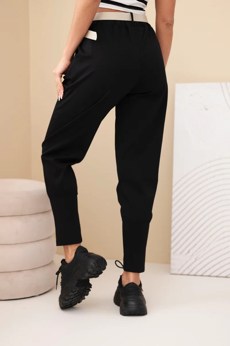 Spodnie damskie bawełniane z wysokim stanem i paskiem czarne Szukasz wygodnych, a jednocześnie stylowych spodni na co dzień? Te spodnie damskie z wysokim stanem to idealne połączenie komfortu i modnego wyglądu. Dzięki elastycznej talii świetnie dopasowują się do sylwetki, a dołączony pasek z ozdobną klamrą dodaje im eleganckiego akcentu. Zwężane nogawki zakończone mankietem nadają całości nowoczesnego charakteru, a miękki materiał sprawia, że idealnie sprawdzą się zarówno w domu, jak i podczas spaceru czy spotkania z przyjaciółmi.
