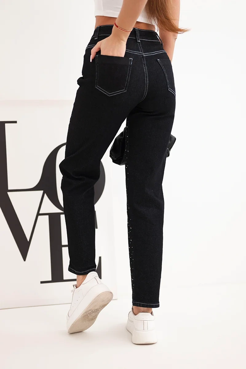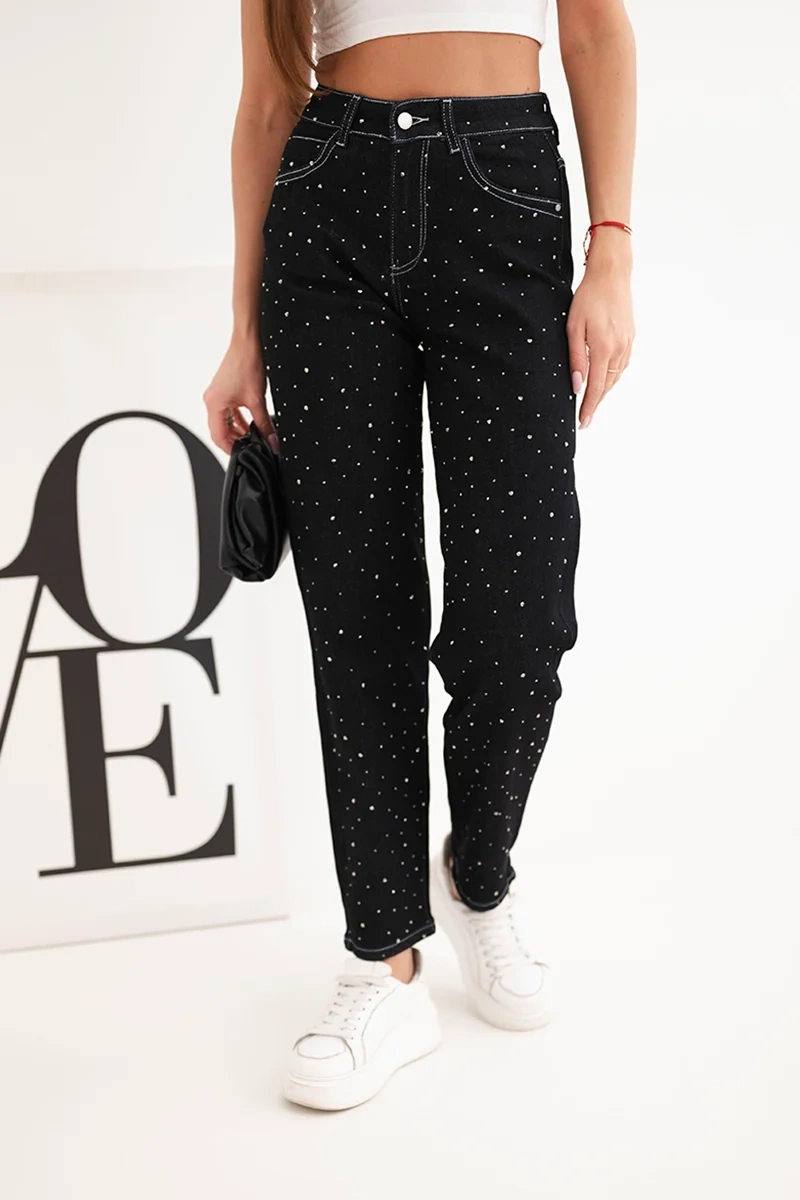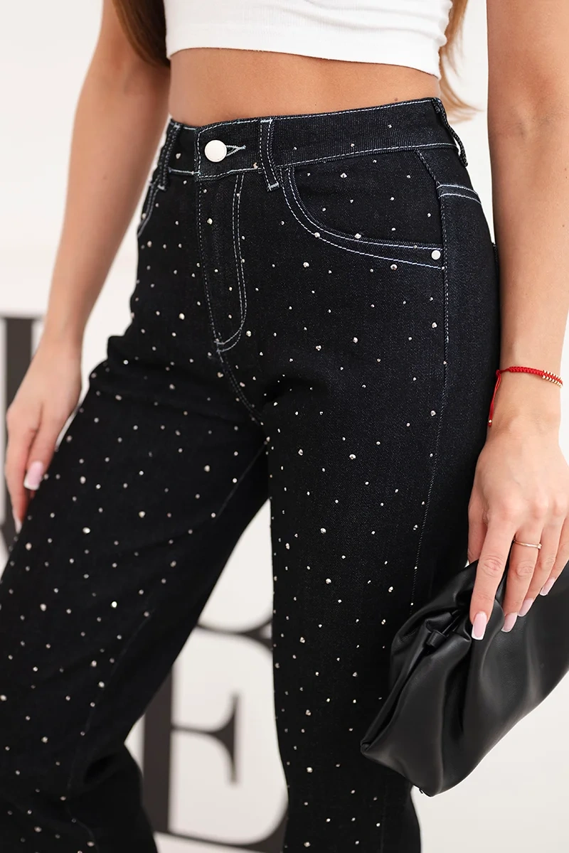 Jeśli szukasz jeansów, które łączą wygodę, styl i modny akcent – te jeansy damskie z wysokim stanem i subtelnymi zdobieniami będą strzałem w dziesiątkę! Klasyczny czarny denim został wzbogacony o delikatne drobinki, które pięknie odbijają światło i dodają elegancji każdej stylizacji. Prosta nogawka i elastyczny materiał sprawiają, że spodnie świetnie układają się na sylwetce i są niezwykle komfortowe w noszeniu.