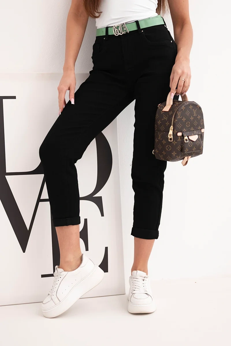 Spodnie damskie jeansowe Mom Fit z wysokim stanem i zielonym paskiem czarne