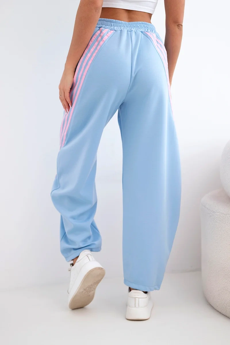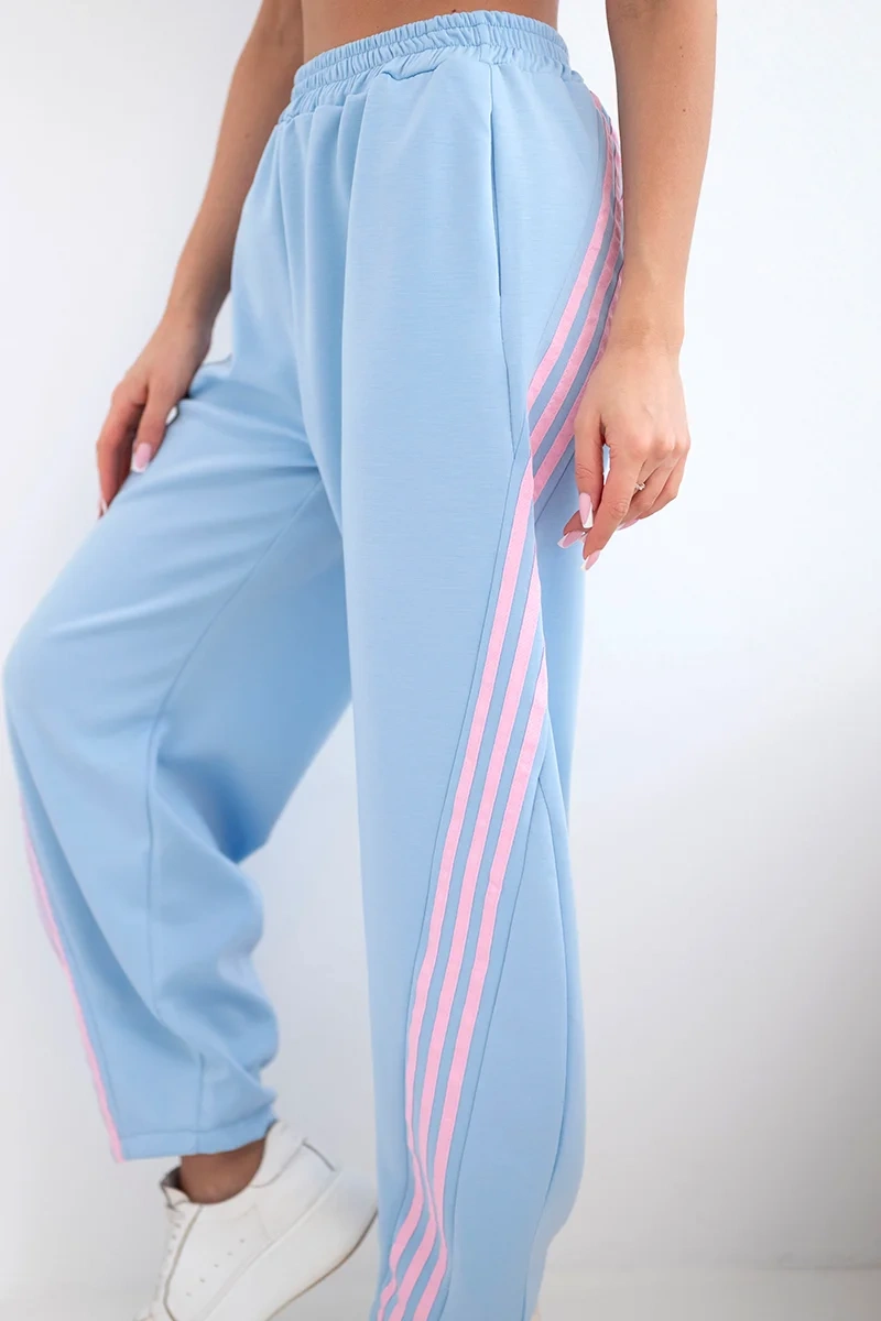 Spodnie damskie masełkowe z wiskozy z lampasem niebieskie Stylowe spodnie damskie wiskozowe masełkowe to idealna propozycja dla kobiet ceniących wygodę i modny, sportowy styl. Model wykonany z miękkiej, przyjemnej w dotyku tkaniny z wysoką zawartością wiskozy doskonale dopasowuje się do sylwetki i zapewnia komfort przez cały dzień.