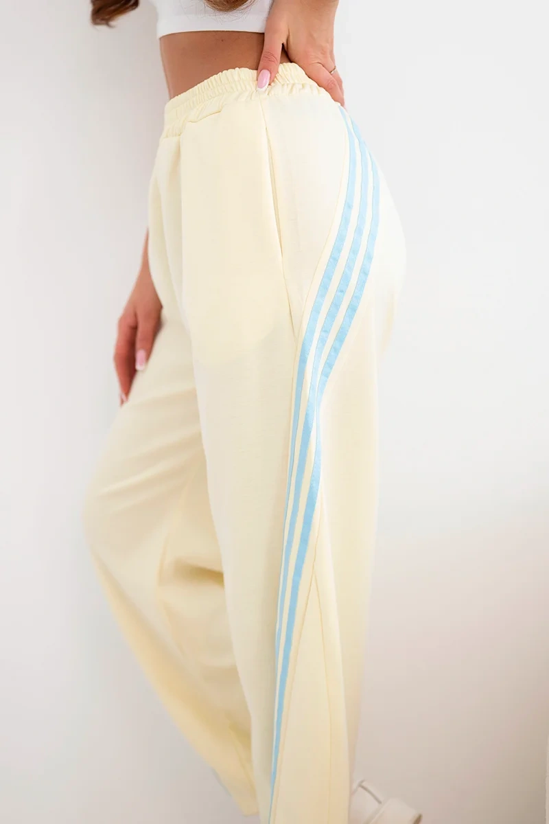 Spodnie damskie masełkowe z wiskozy z lampasem żółte Stylowe spodnie damskie wiskozowe masełkowe to idealna propozycja dla kobiet ceniących wygodę i modny, sportowy styl. Model wykonany z miękkiej, przyjemnej w dotyku tkaniny z wysoką zawartością wiskozy doskonale dopasowuje się do sylwetki i zapewnia komfort przez cały dzień.