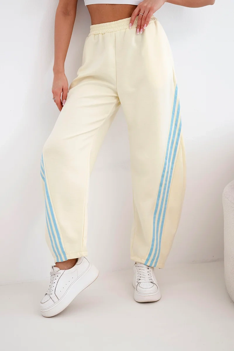 Elastyczna talia gwarantuje wygodne dopasowanie, a luźniejszy fason zapewnia swobodę ruchów. Modne lampasy po bokach nogawek nadają całości sportowego charakteru i optycznie wysmuklają sylwetkę. Spodnie świetnie sprawdzą się w codziennych stylizacjach – zarówno w połączeniu z t-shirtem, bluzą czy sneakersami.