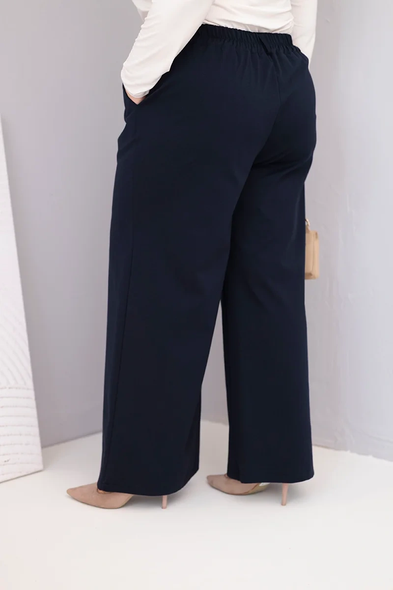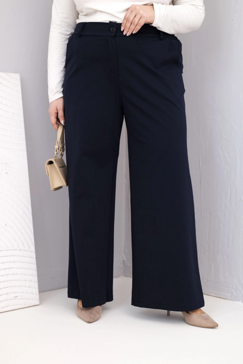 Spodnie damskie Plus Size z szeroką nogawką i wysokim stanem granatowe Szukasz wygodnych, a jednocześnie stylowych spodni na każdą okazję? Te spodnie damskie z szeroką nogawką i wysokim stanem to idealny wybór dla kobiet, które cenią sobie komfort i modny wygląd. Luźny krój zapewnia swobodę ruchów, a materiał z dodatkiem spandexu doskonale dopasowuje się do sylwetki, podkreślając jej atuty.